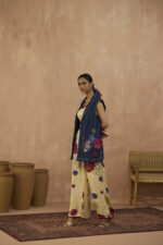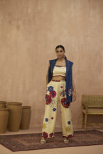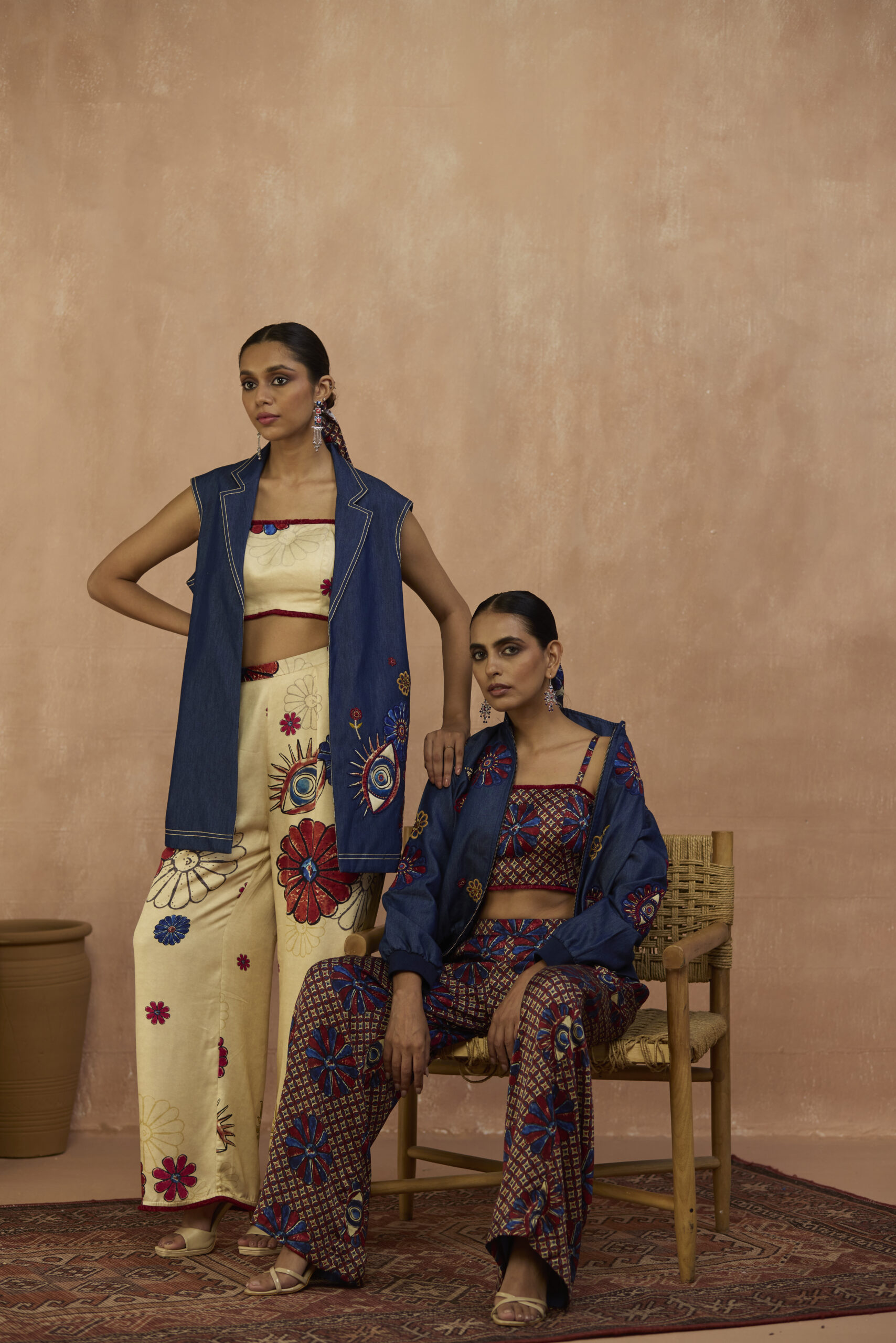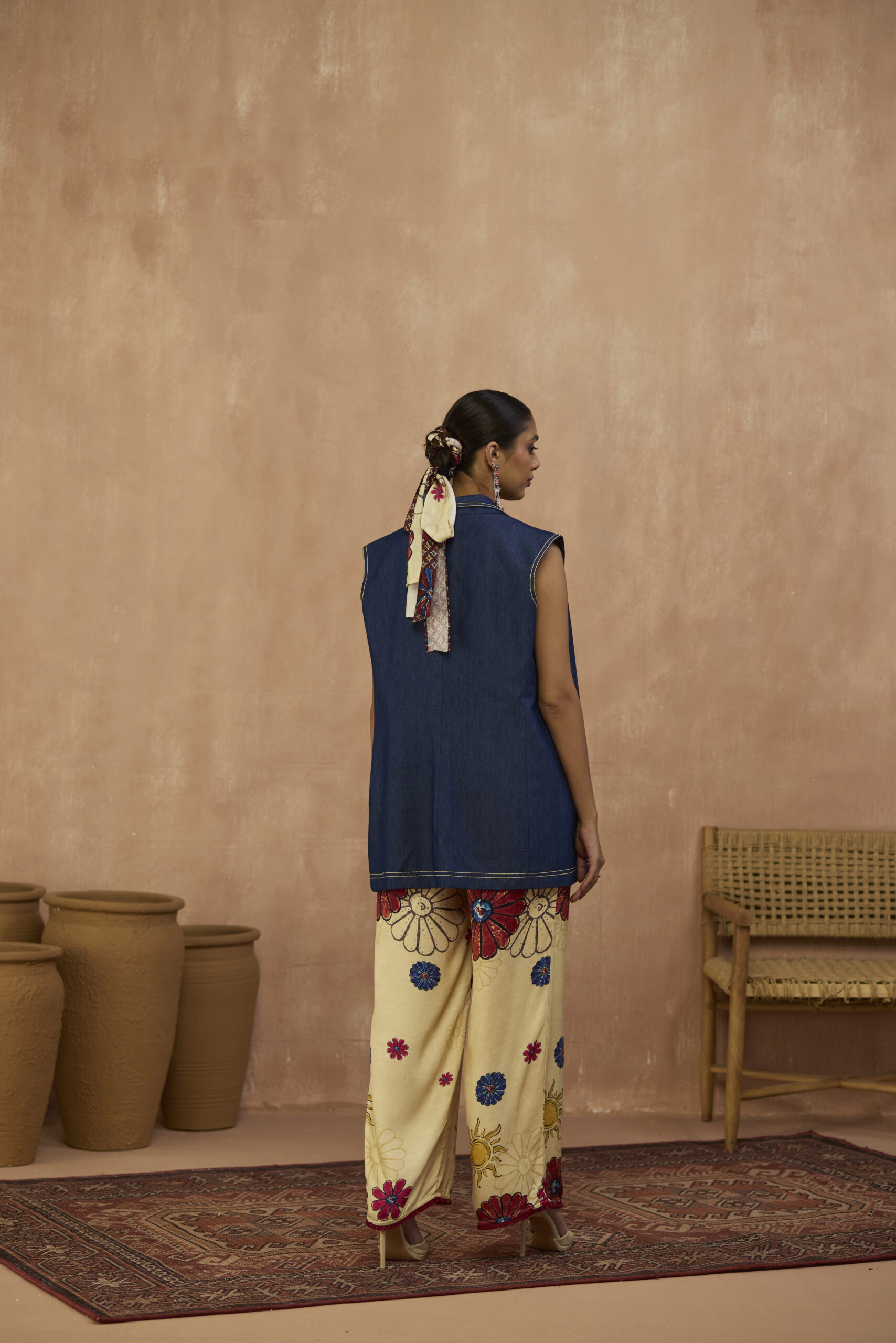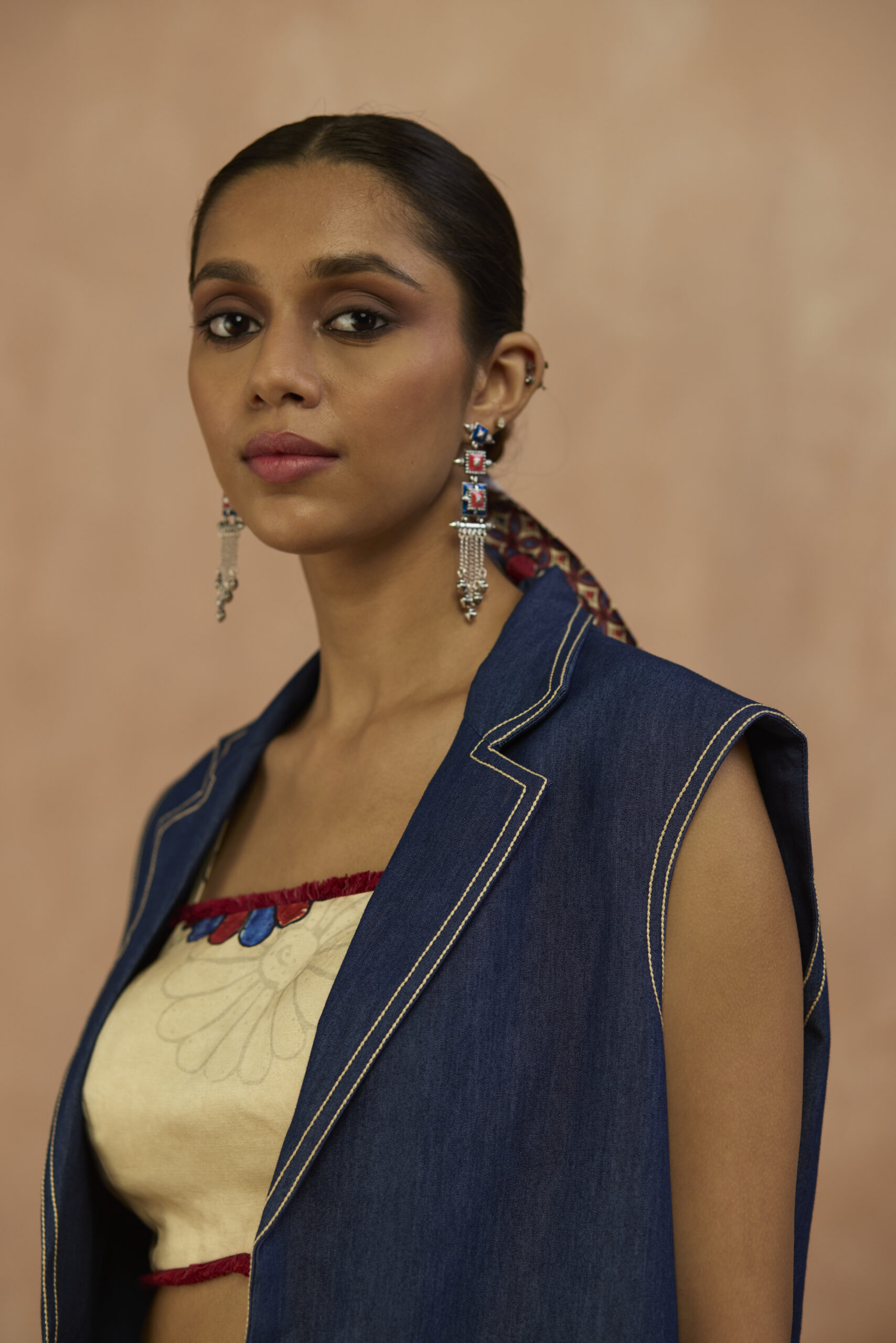 Denim Sleeveless Jacket with Intricate applique and beadwork effortlessly paired with signature satin pleated pants & crop top with fringe detailing