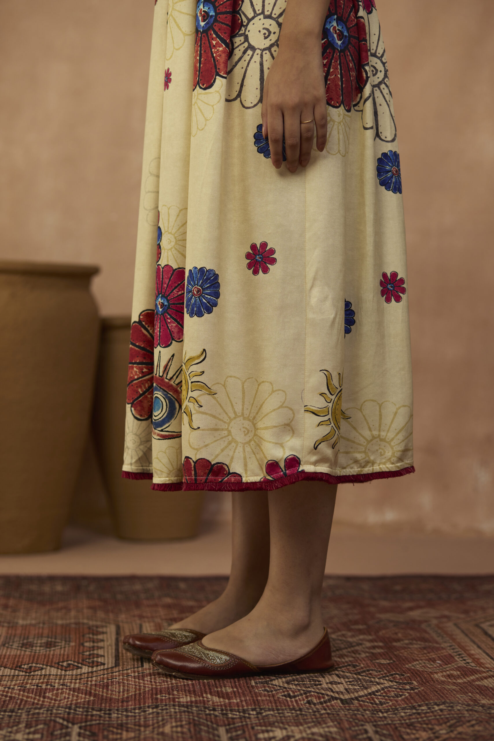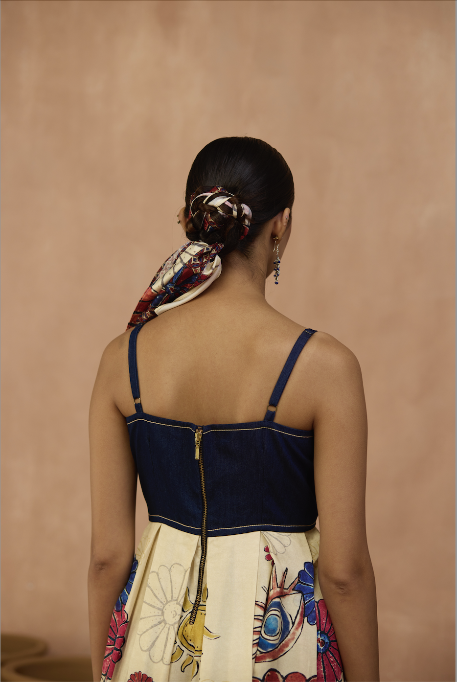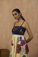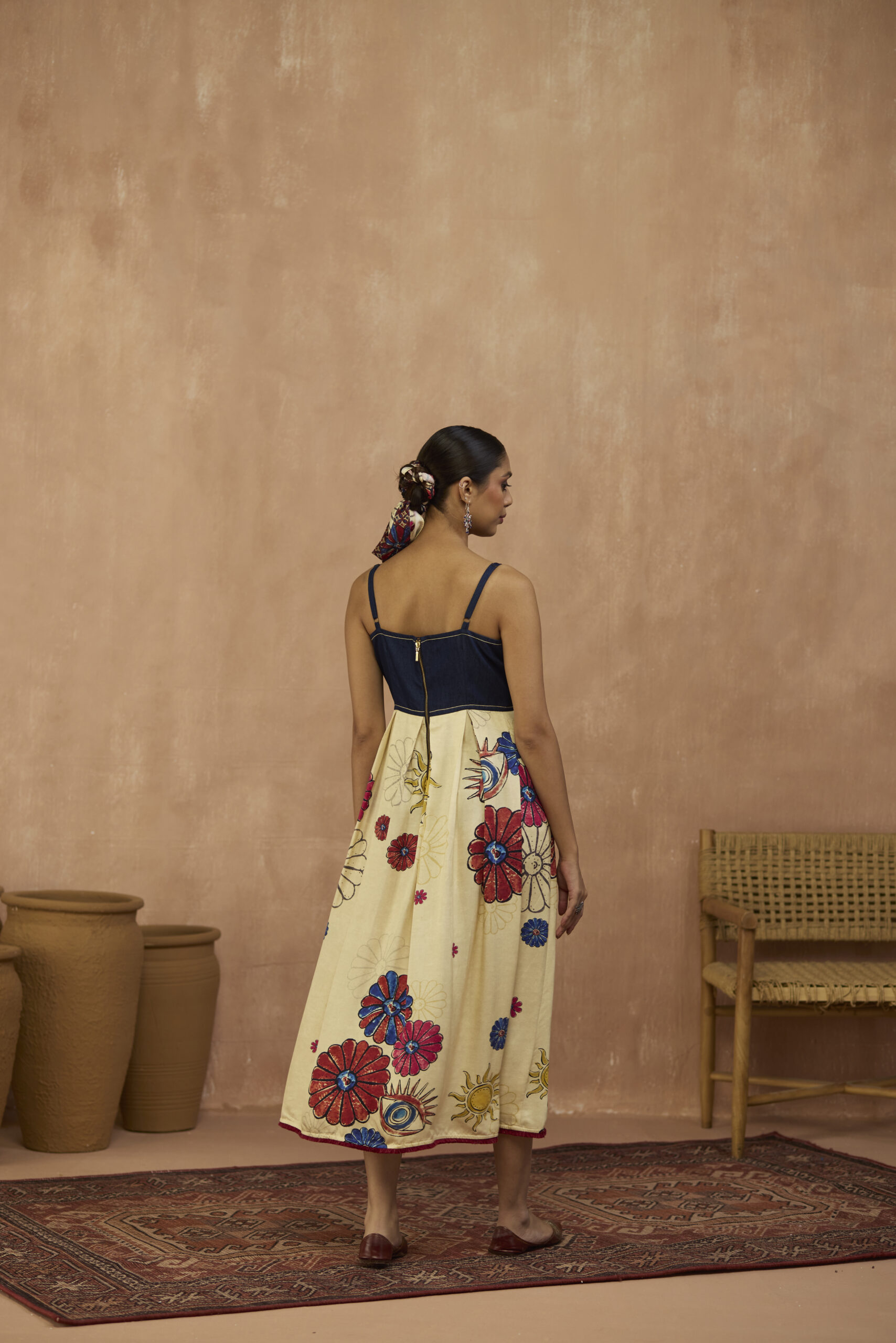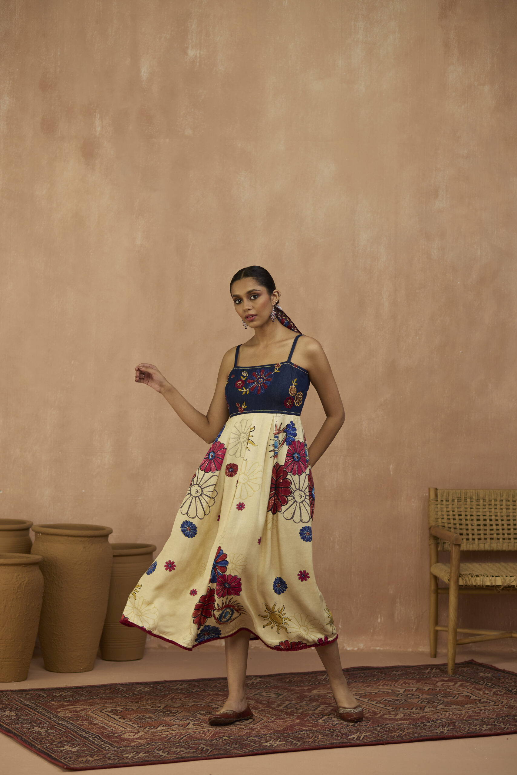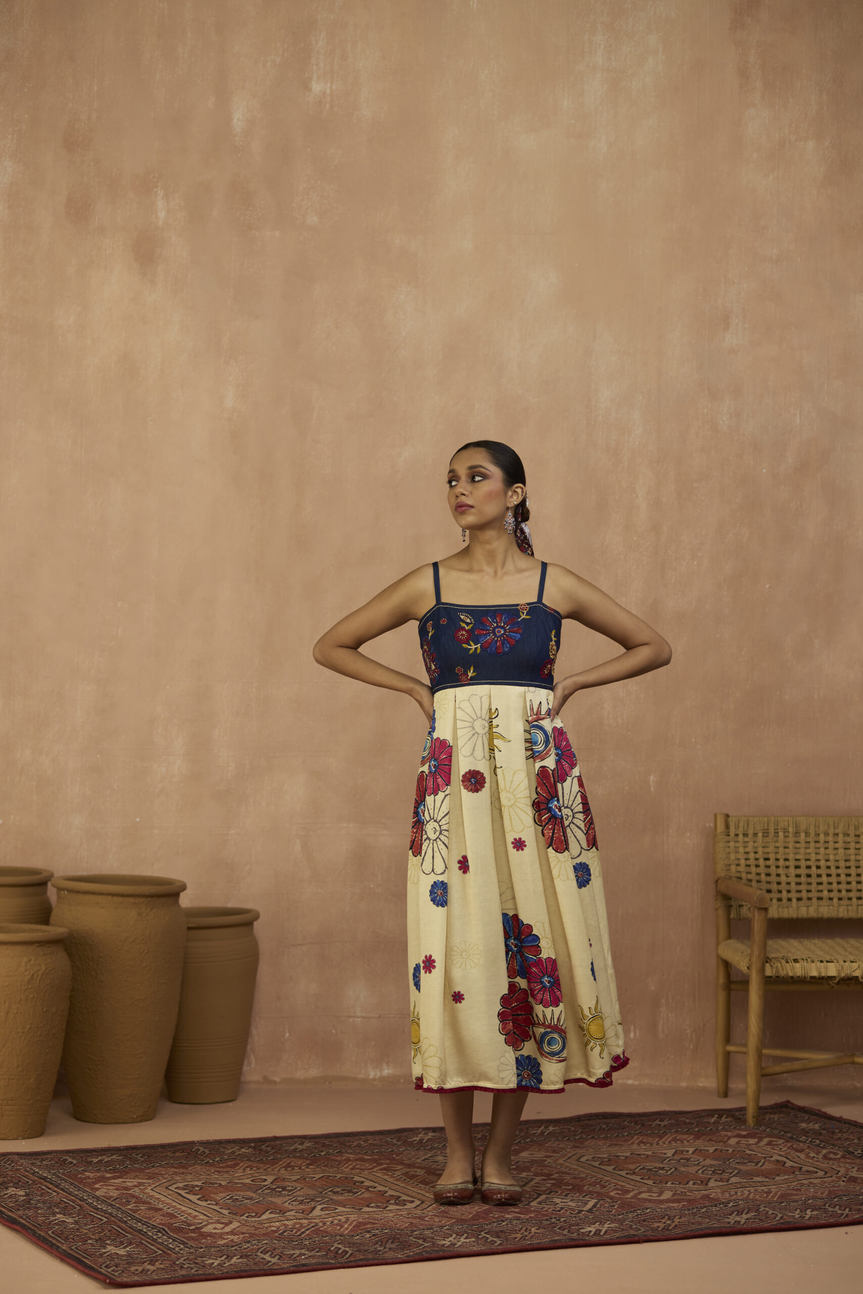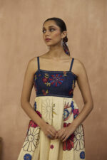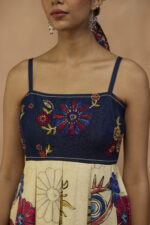 Strap square neck dress with denim yoke with applique and beadwork & stitch details. The pleats with fringe give a chique touch to the ensemble.