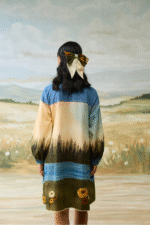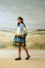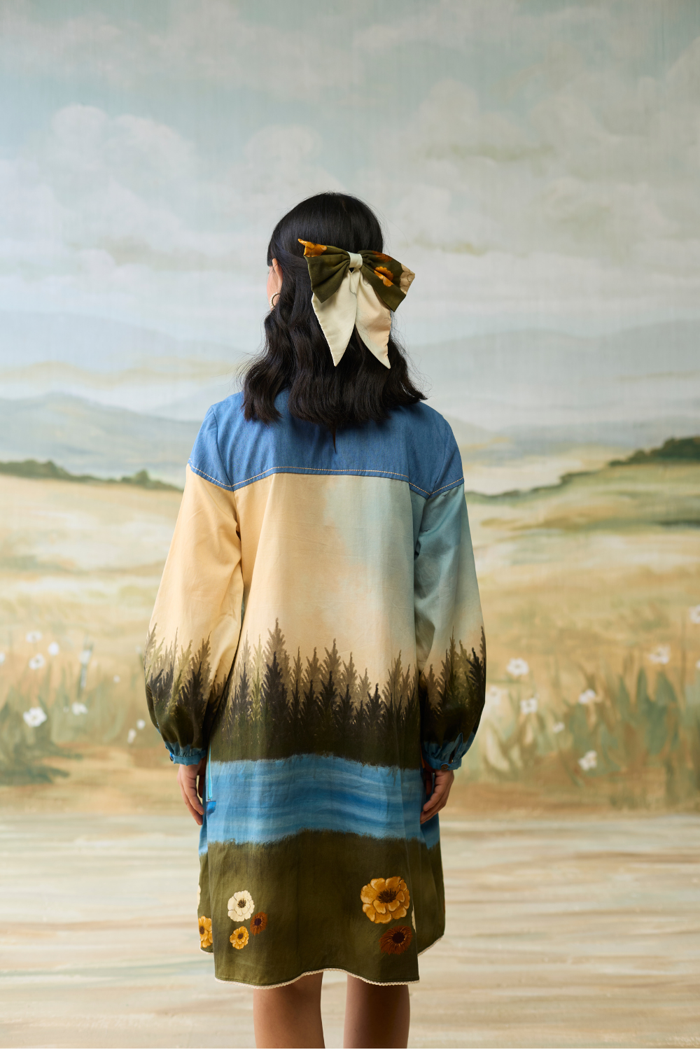A whimsical daydream of a dress featuring an intricately embroidered denim yoke paired with a serene scenic print and pleated detailing with print sleeves for a touch of romantic flair. It comes with a belt to accetuate the waist.