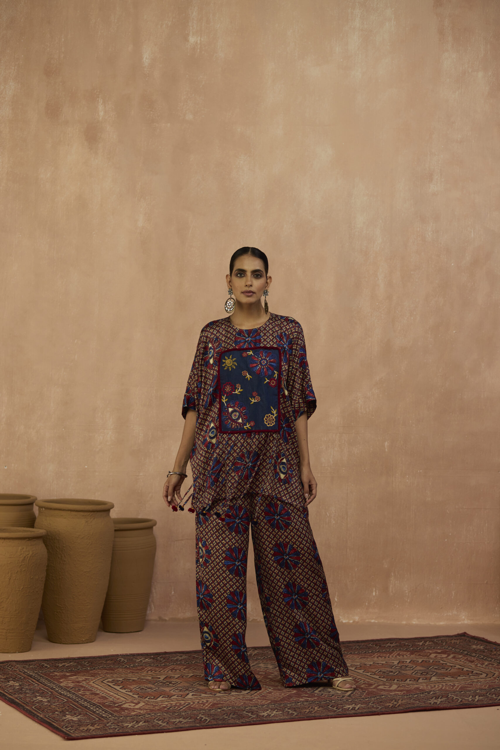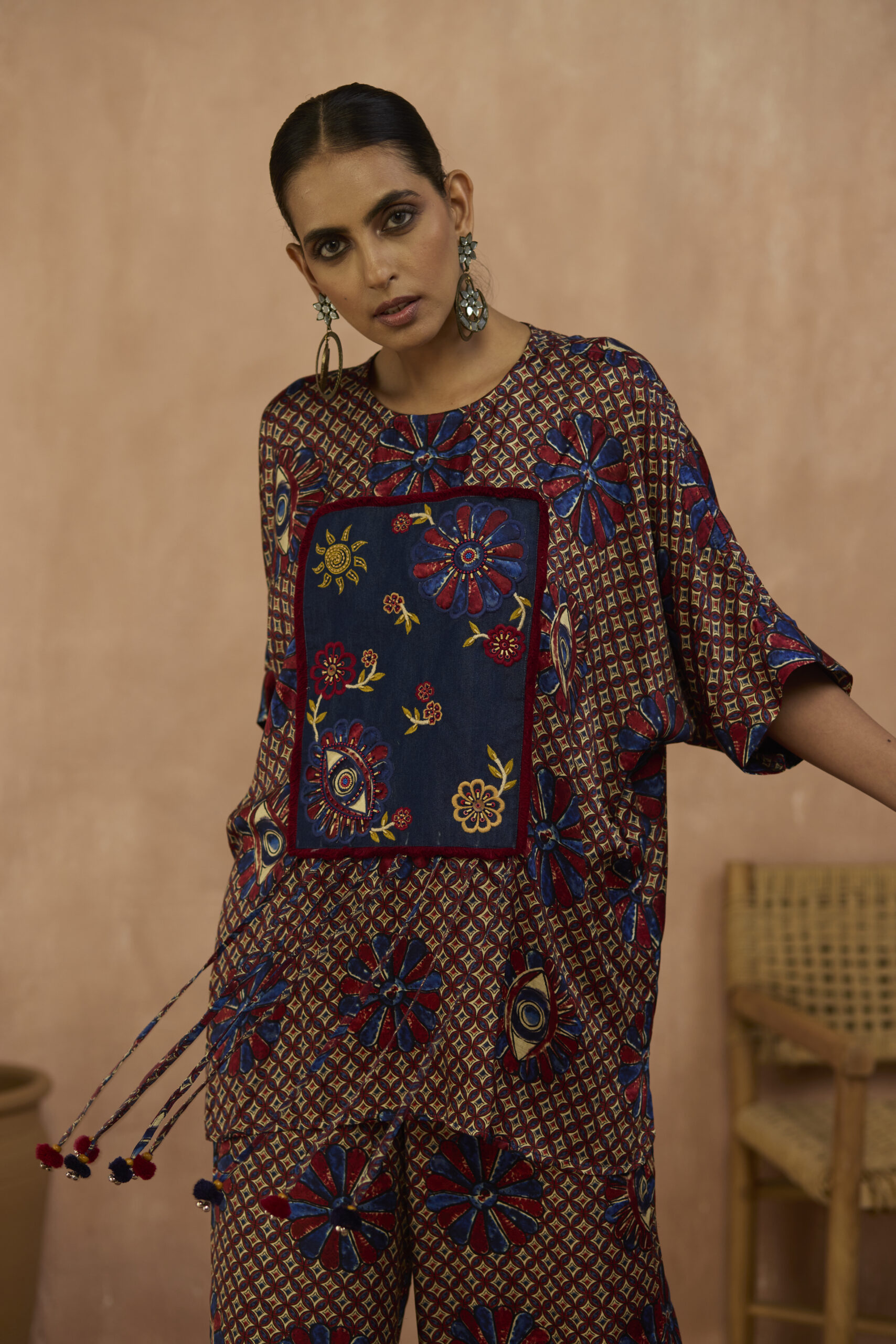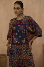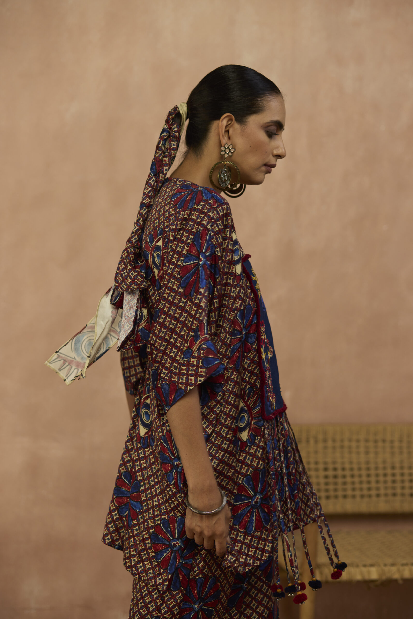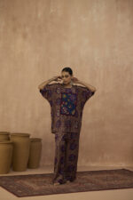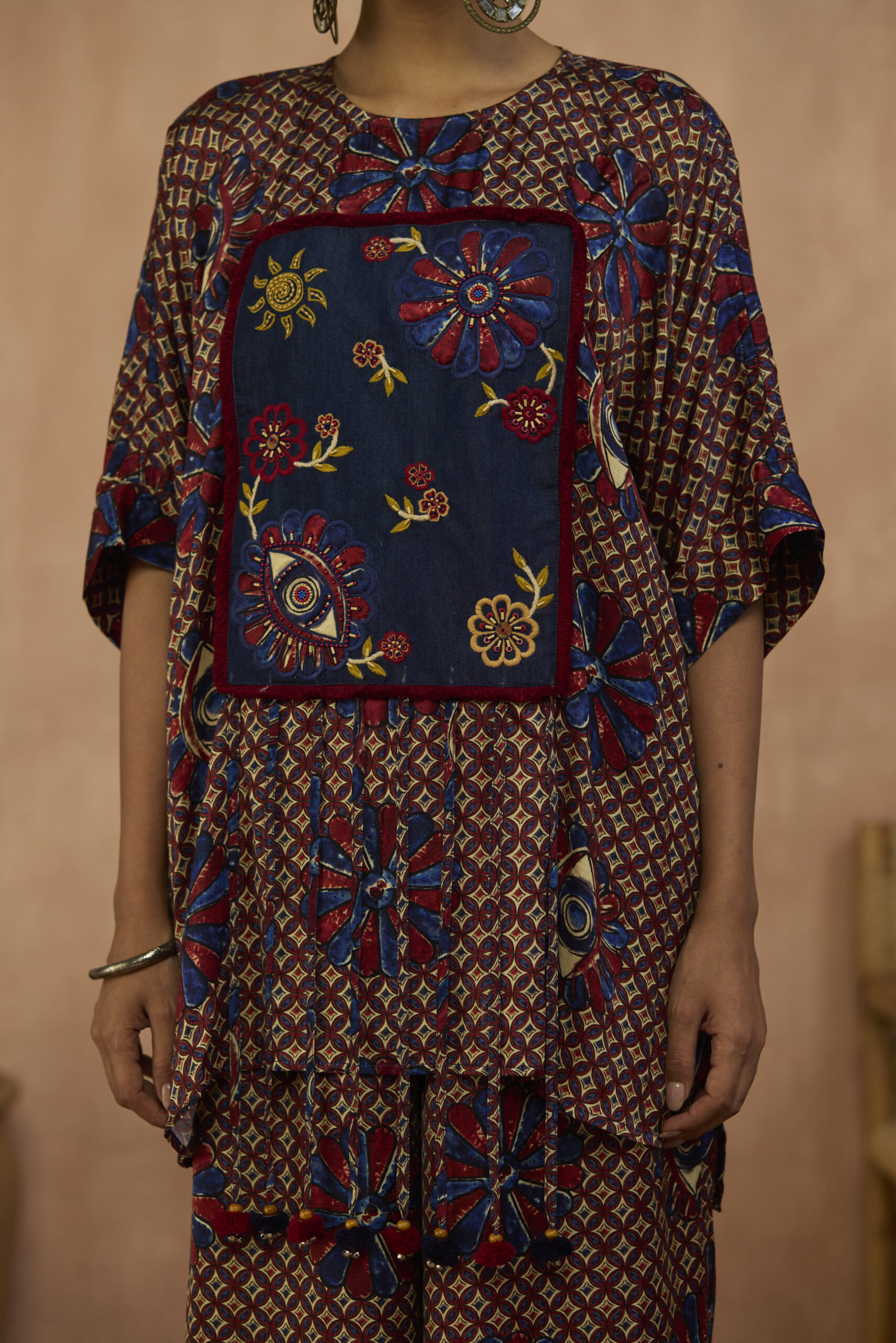 The kaftan top highlights the embroidered denim yoke with intricate tassel hangings paired with comfy satin pants with fringe details.