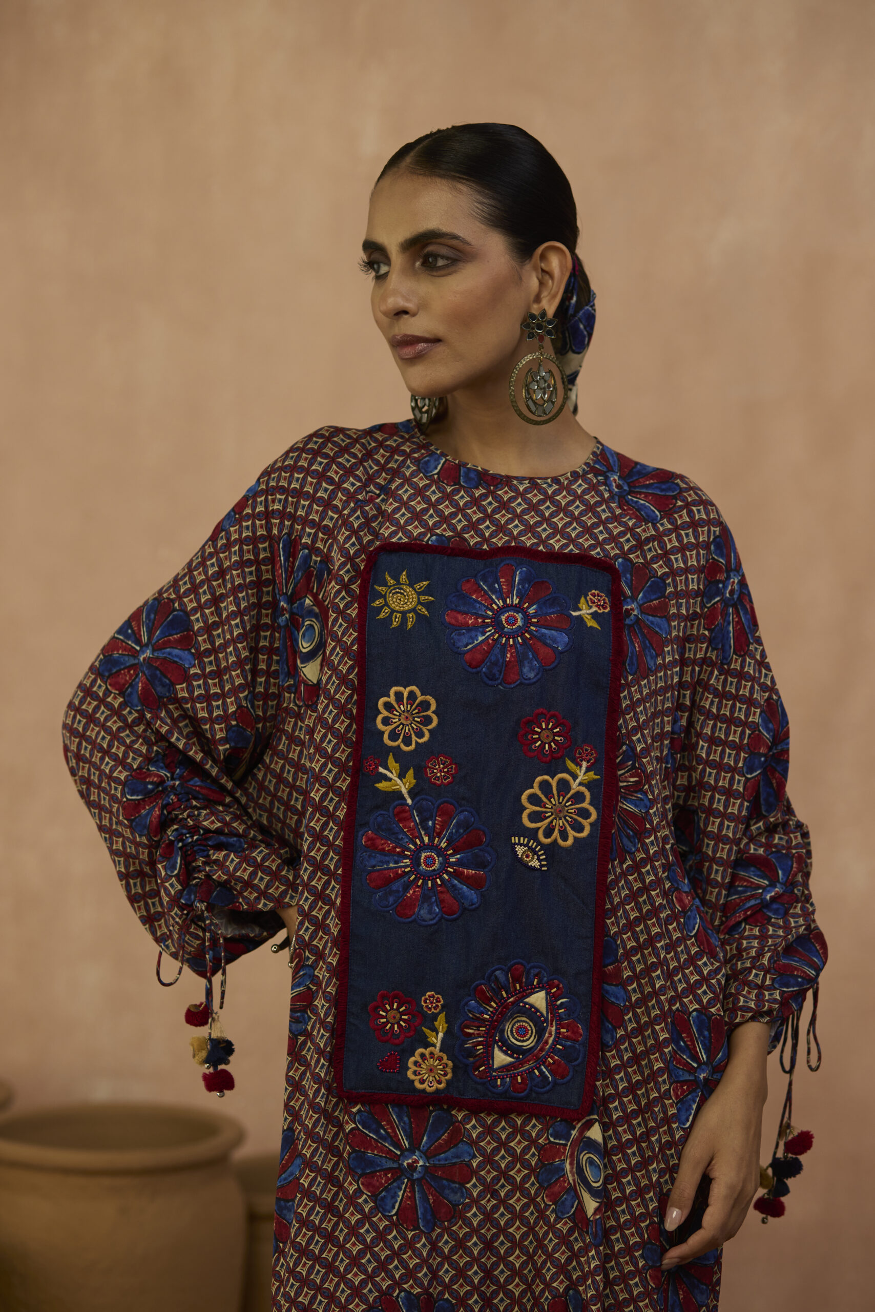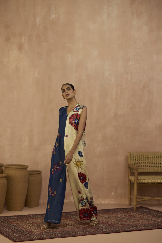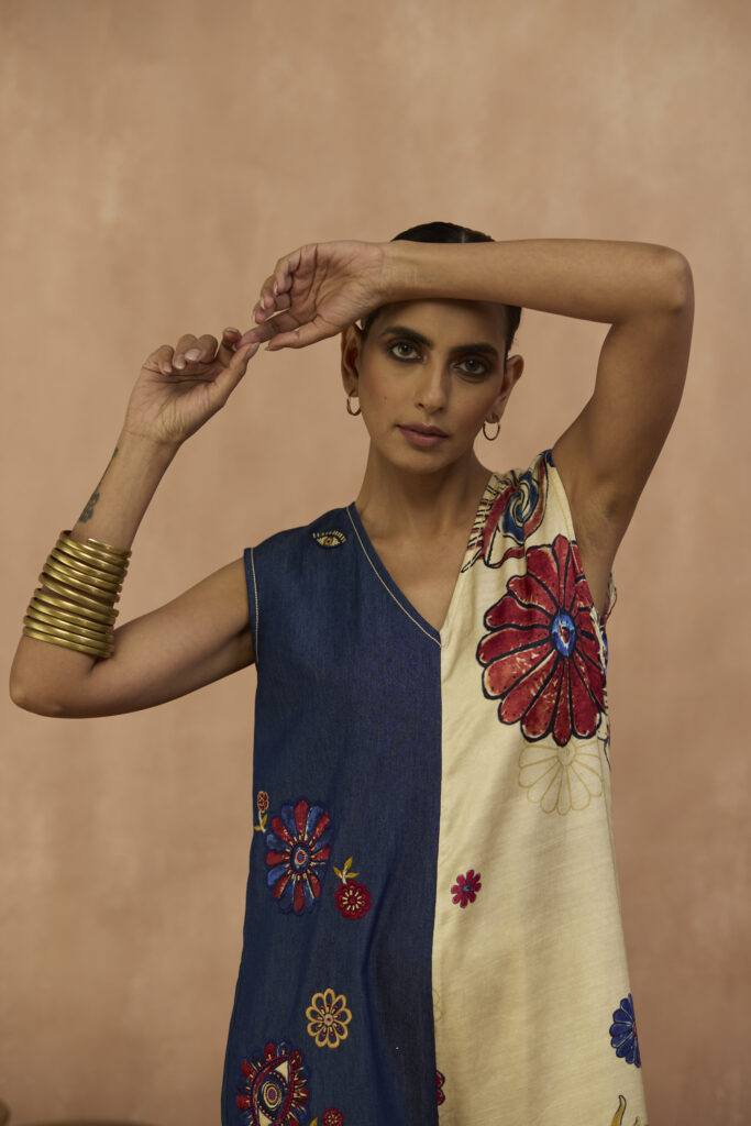 Indie inspired dress in crepe with beaded denim yoke with dangling sleeve details in pom poms.
