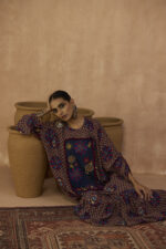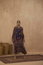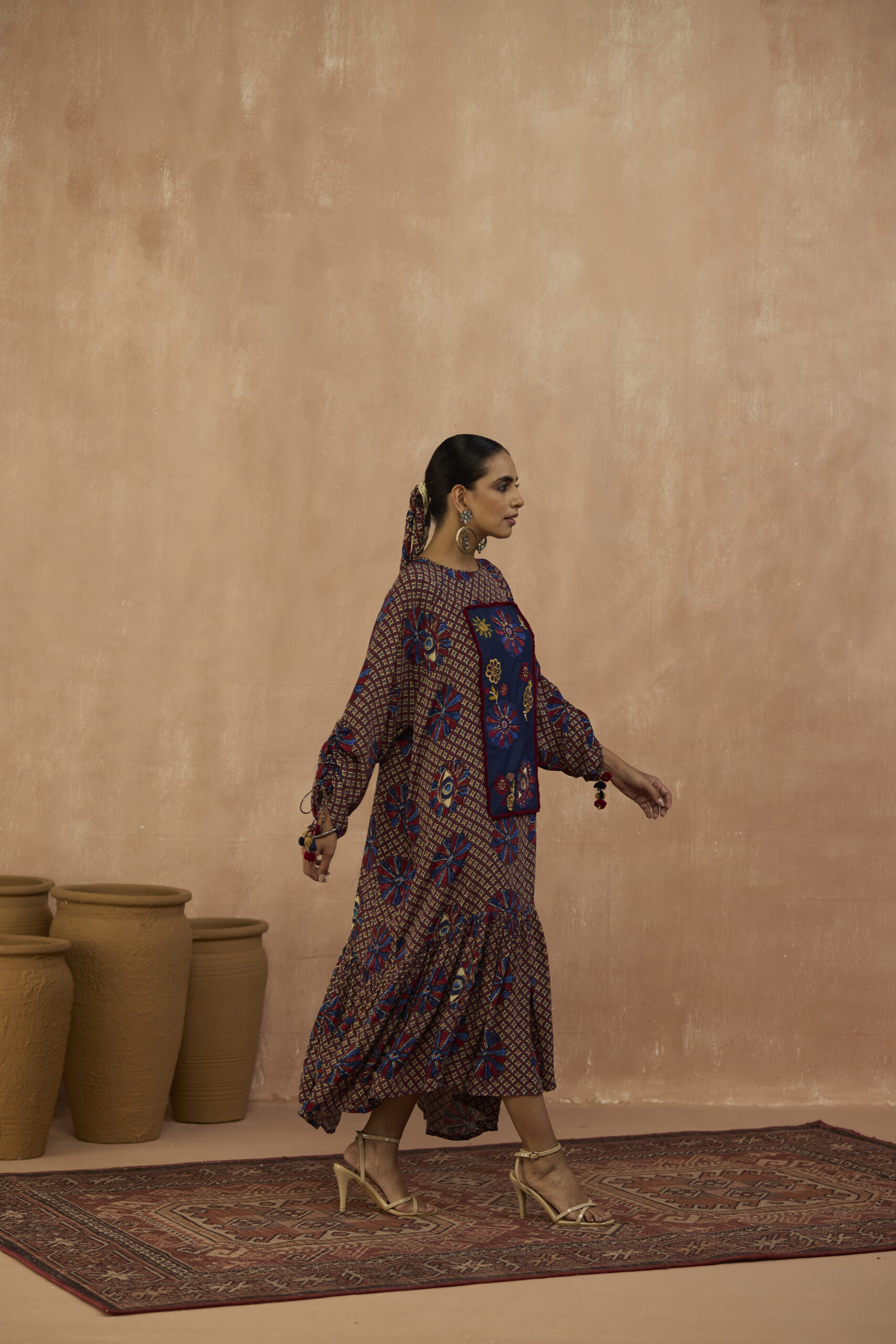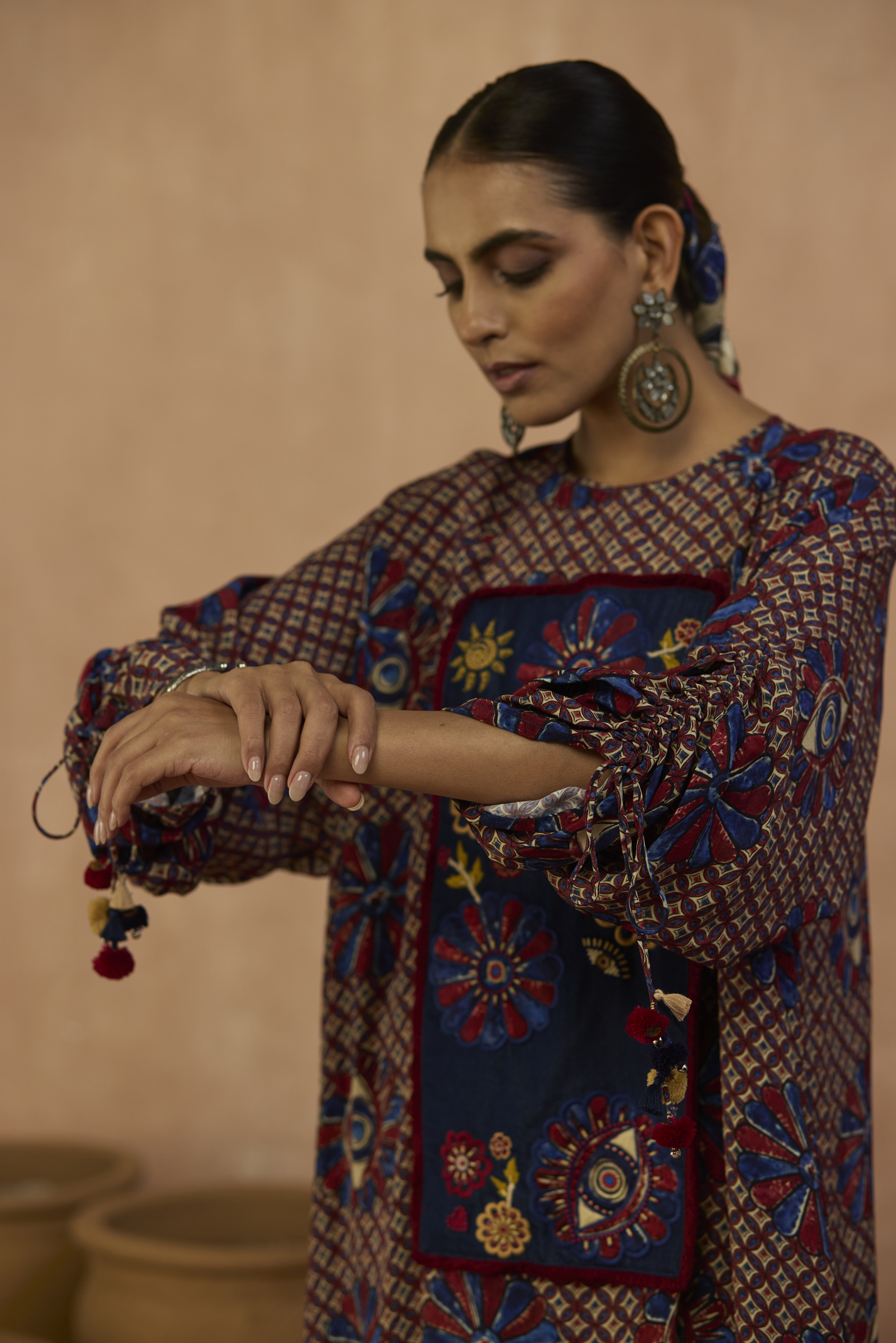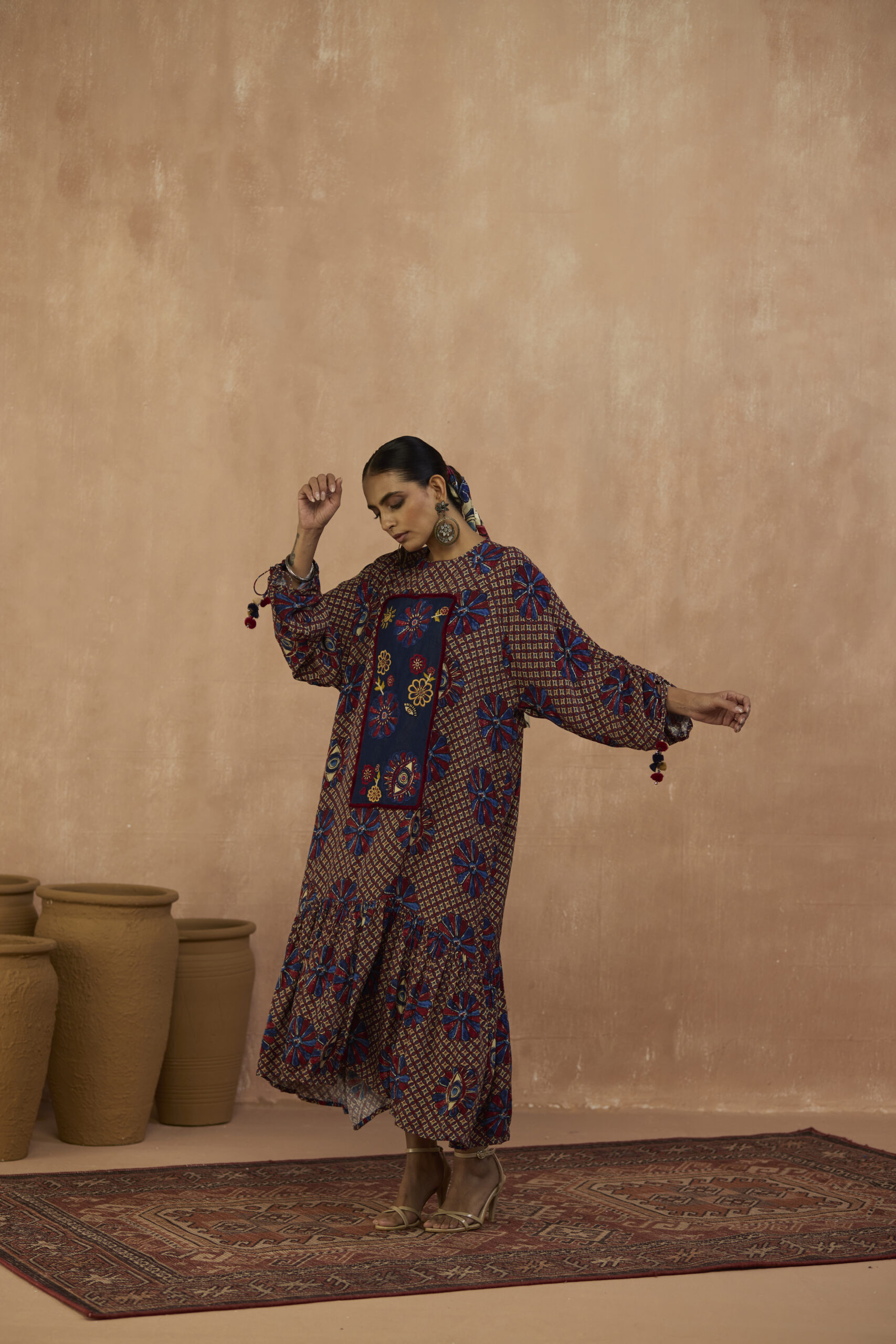 Indie inspired dress in crepe with beaded denim yoke with dangling sleeve details in pom poms.