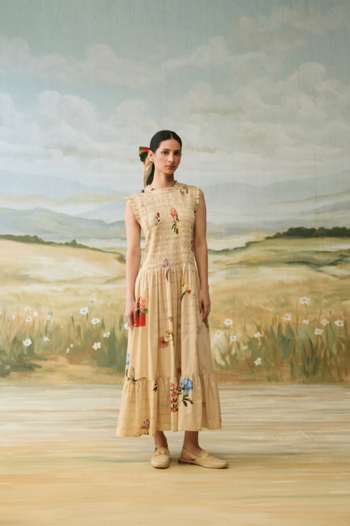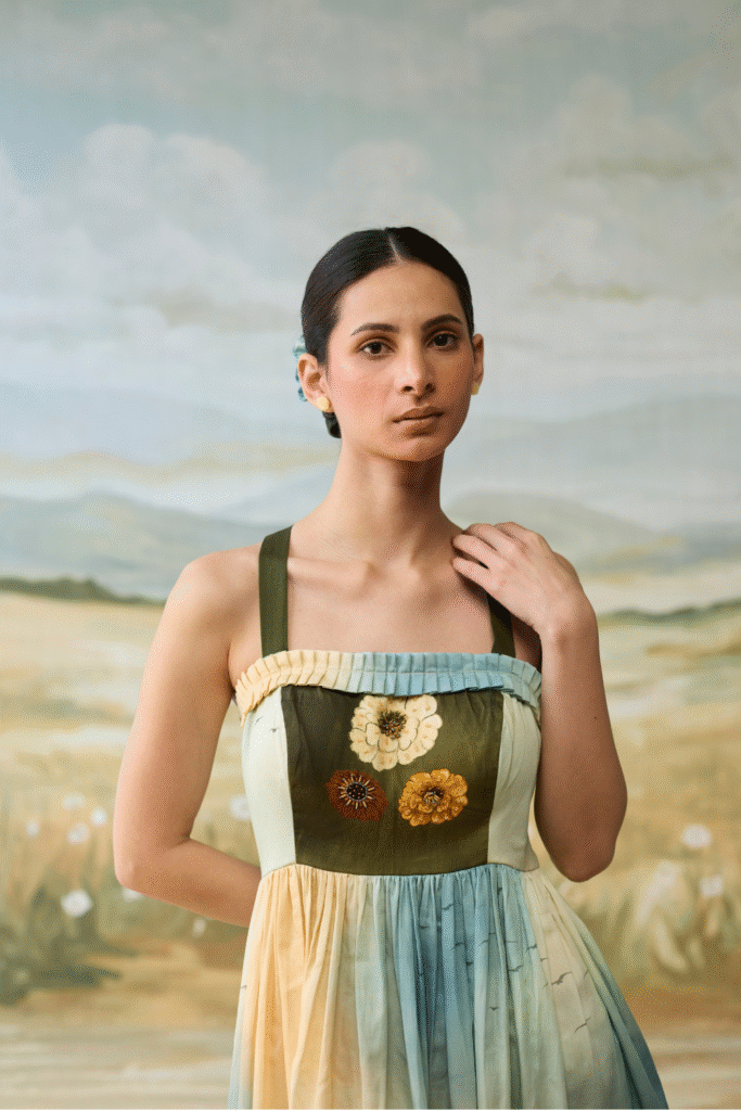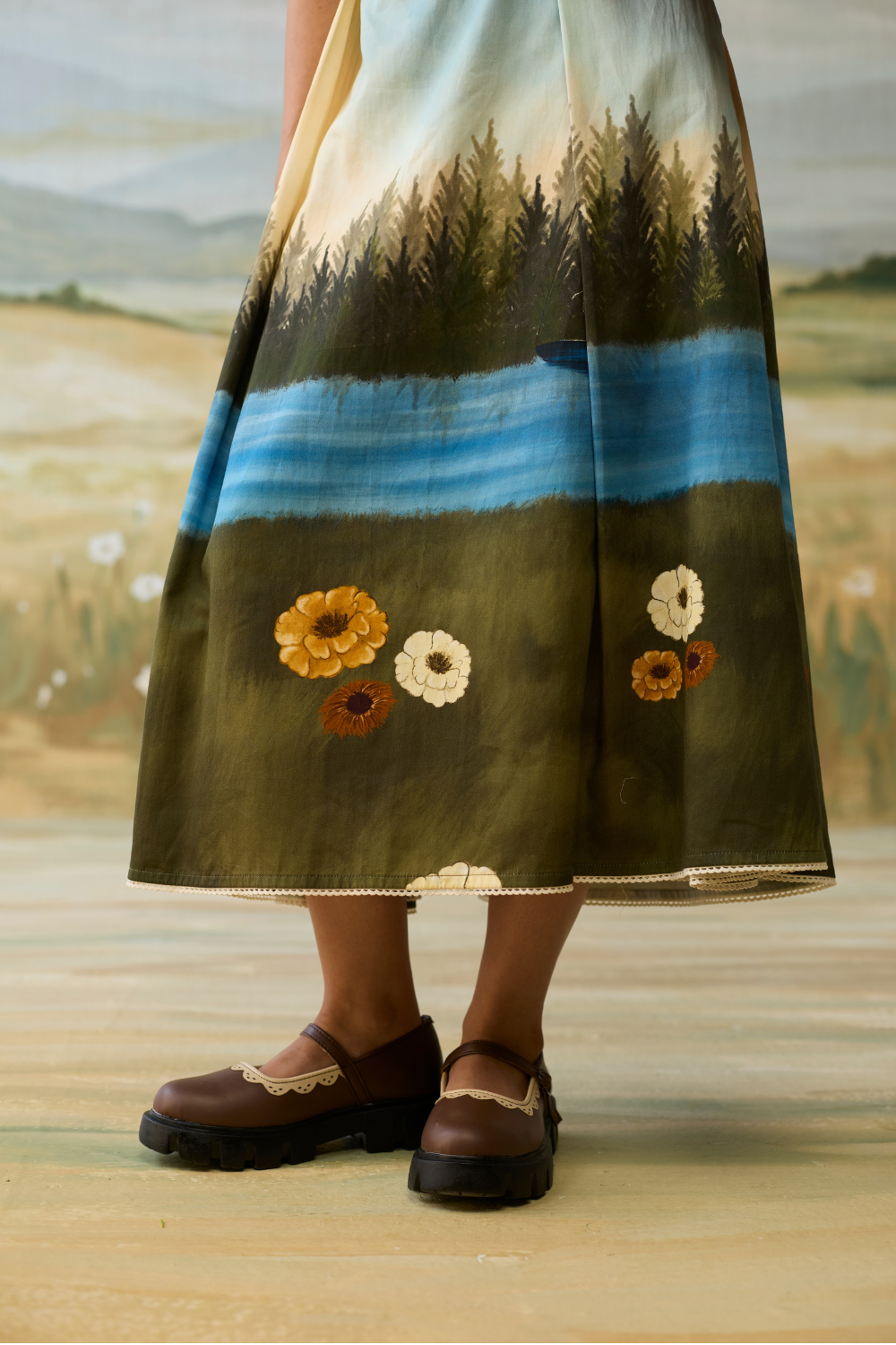 Enjoy the radiance of nature in our Reverie dress with embellished yoke, graced by handpainted scenic view. Embrace the natural charm and style in this stunning piece.