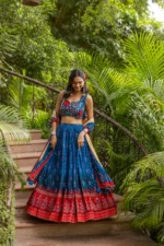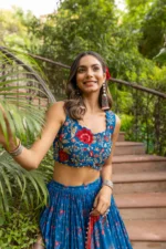 Embroidered blouse paired with Blue Signature printed lehenga and dupatta.