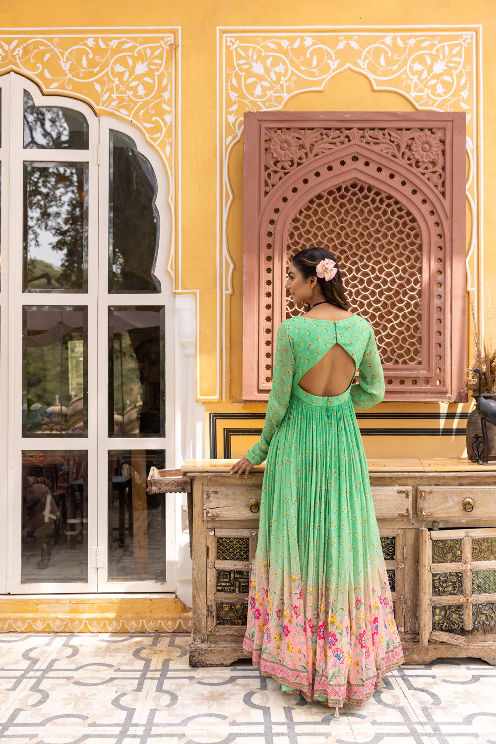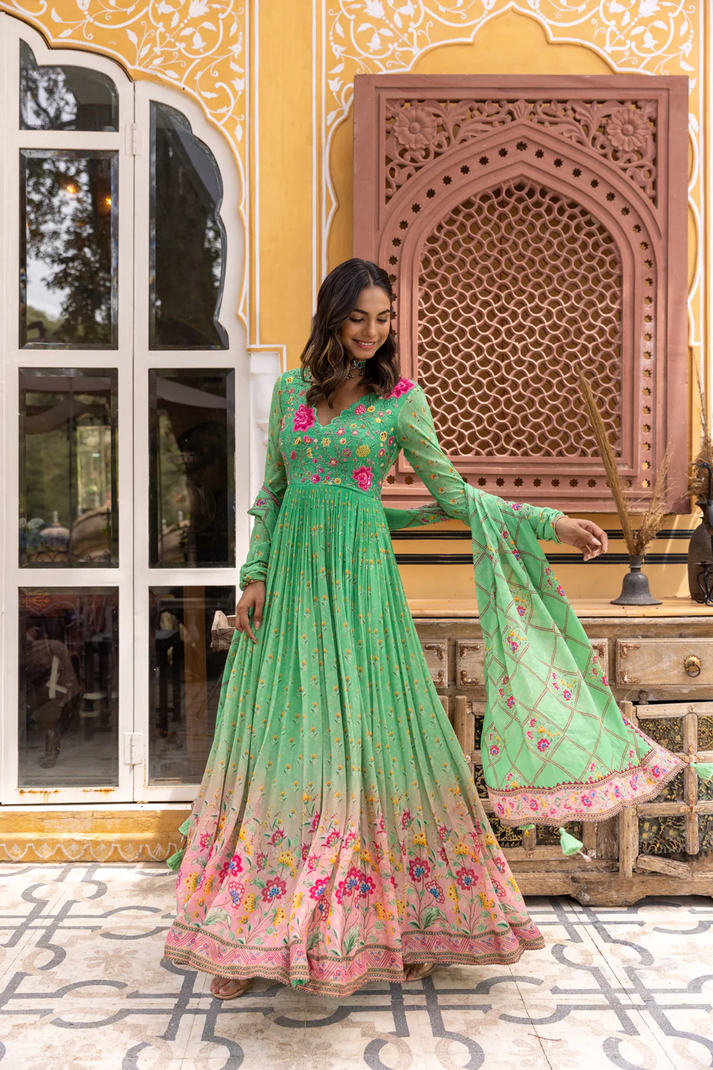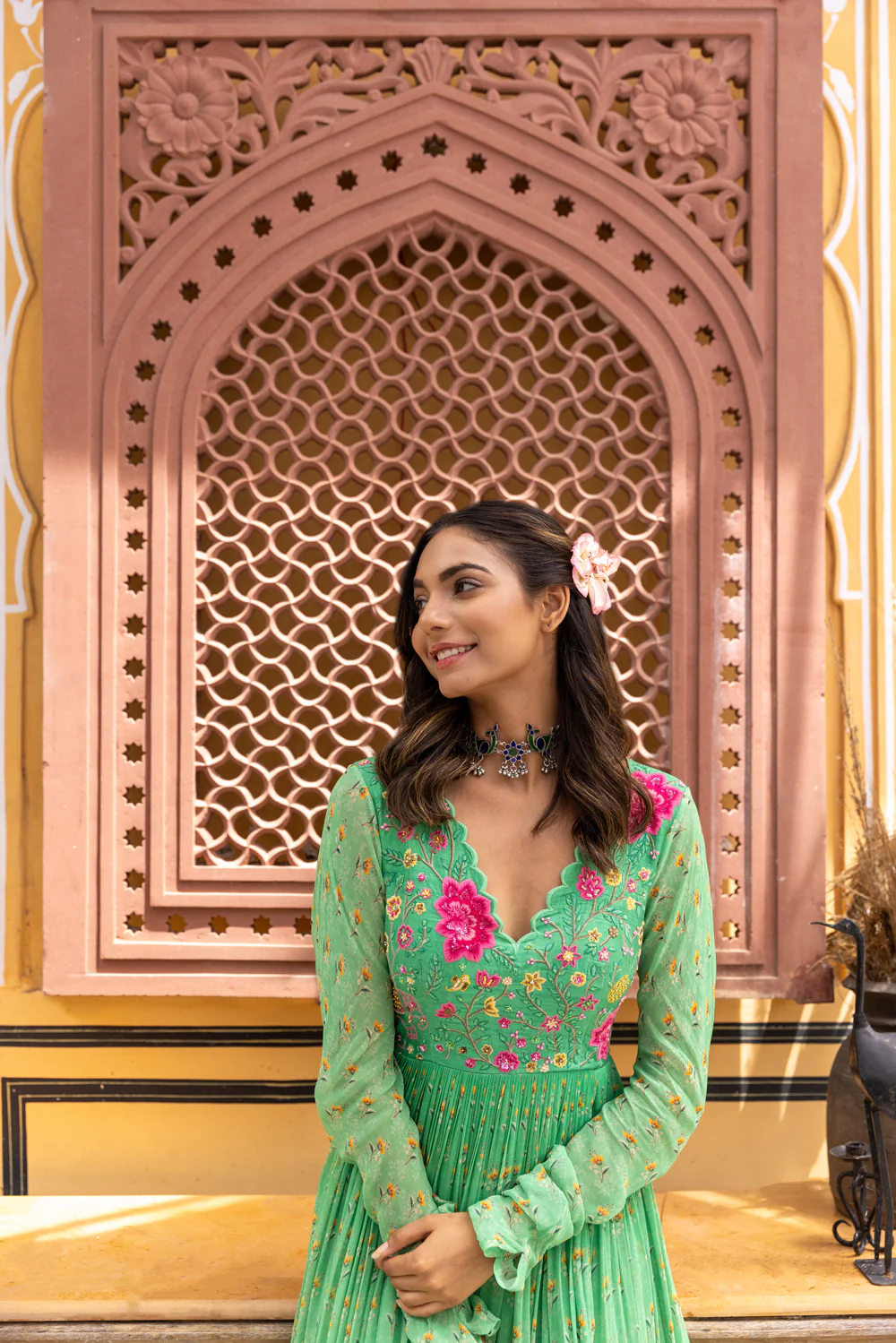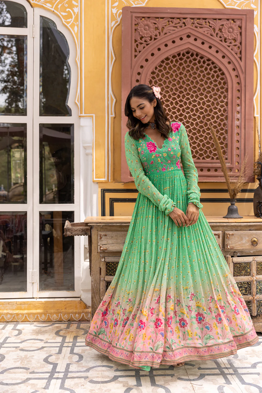 Embroidery: Yoke and Sleeves embroidered with thread, beads, sequins and pearls.
