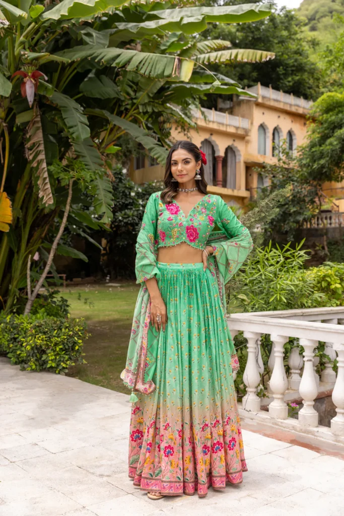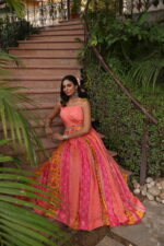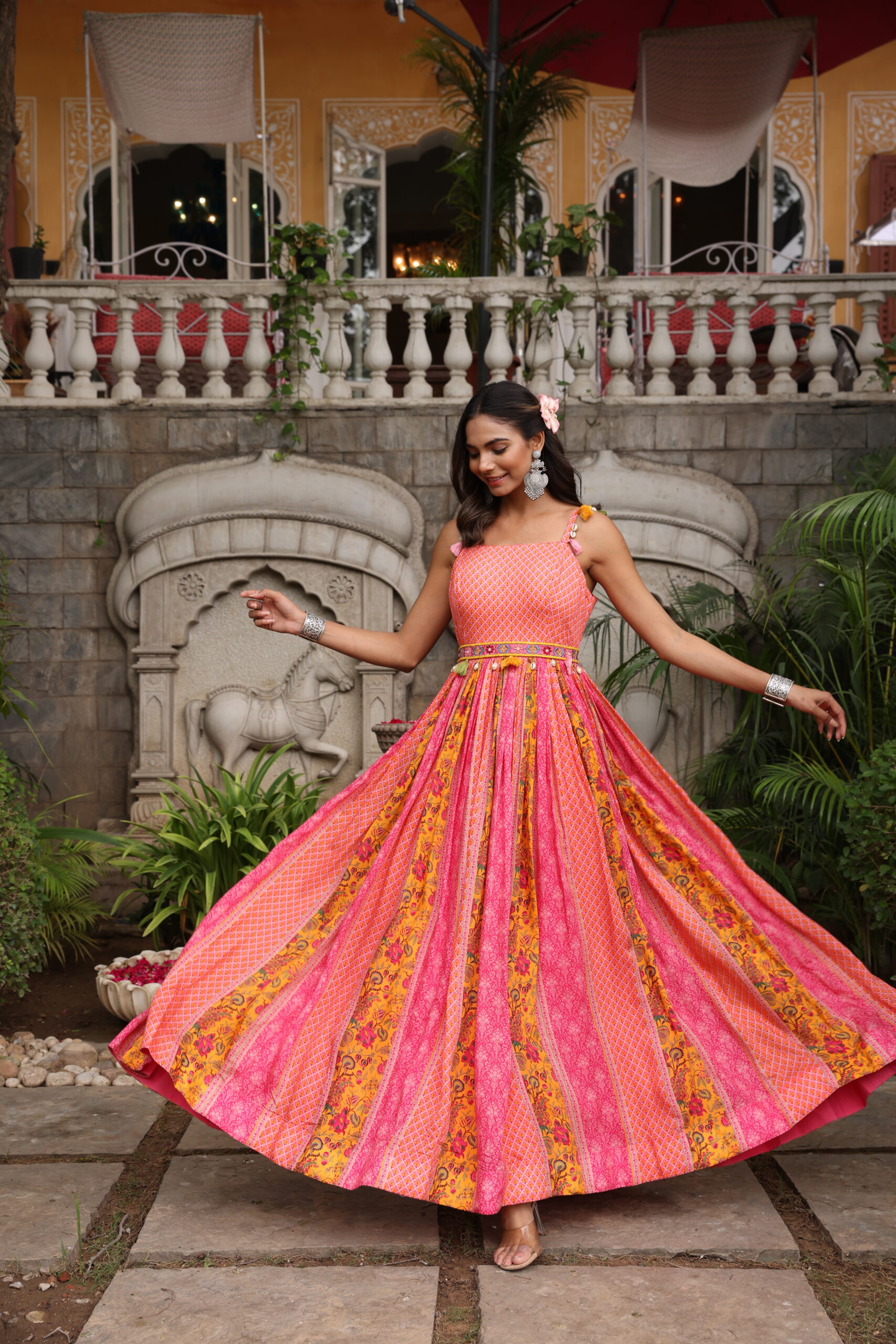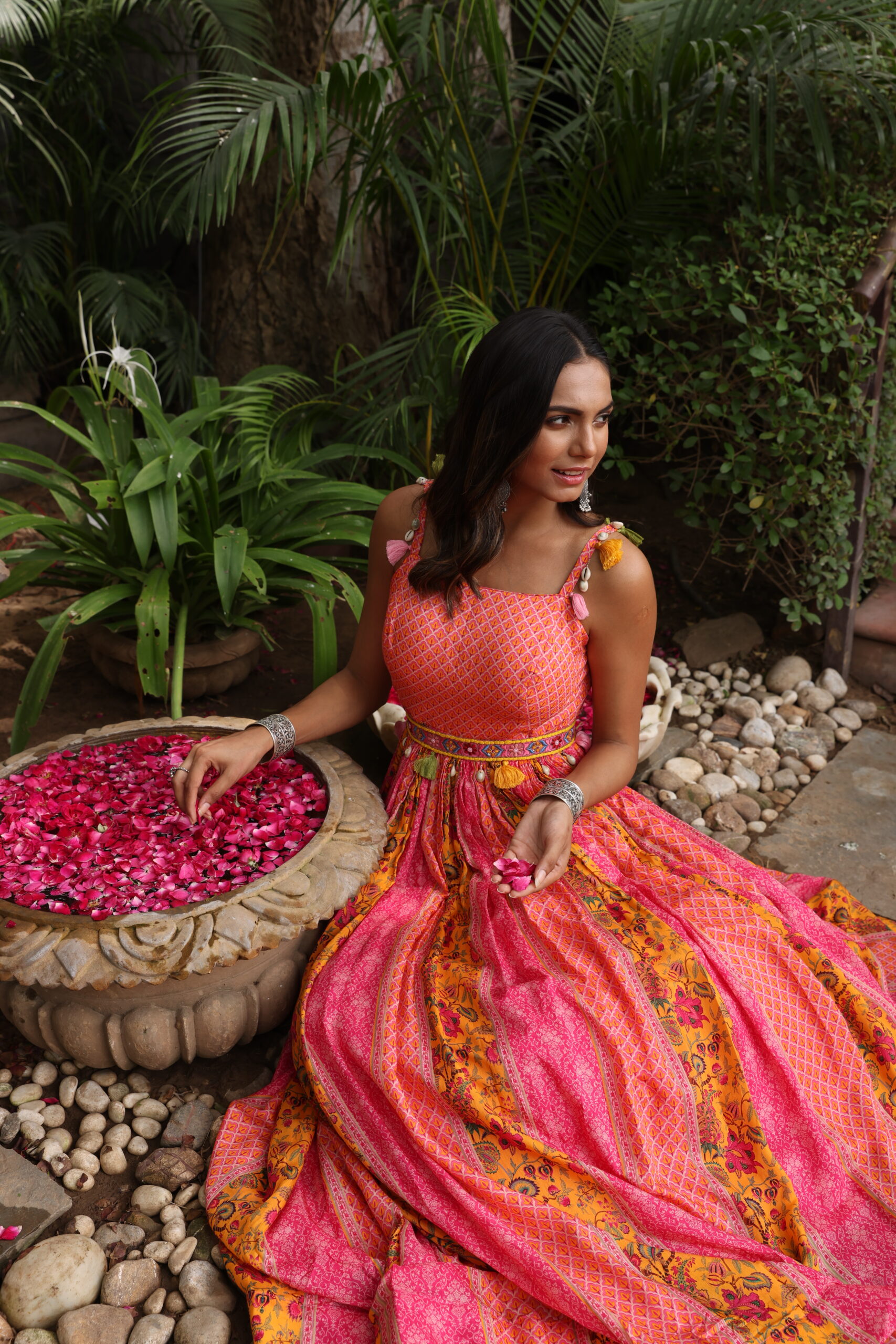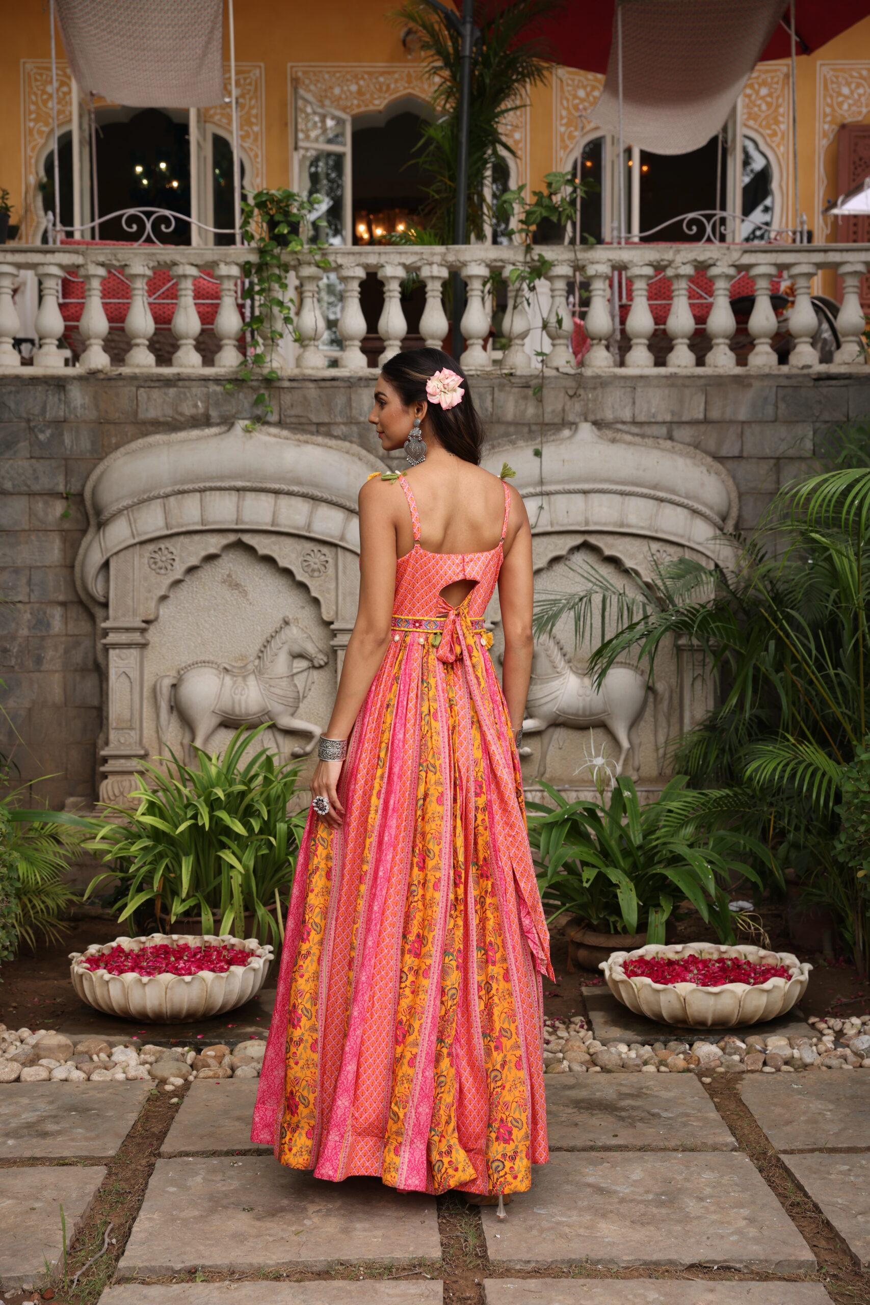 Pink Patchwork printed gathered gown with embellished belt and tassel details.
