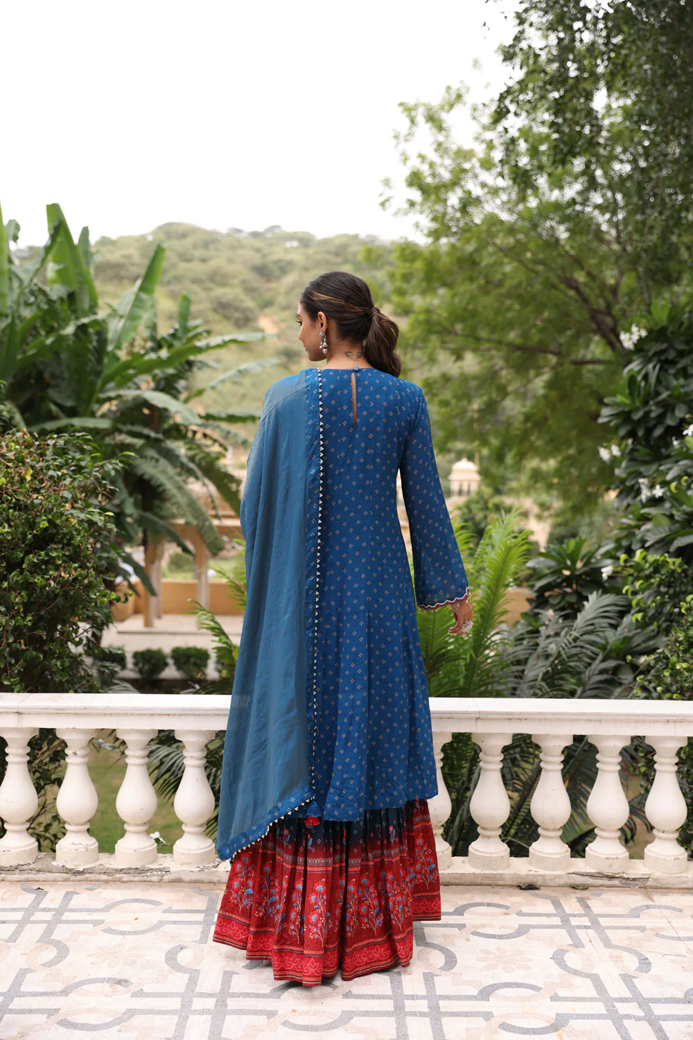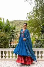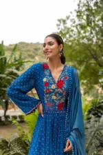 Blue silk embroidered yoke kurta paired with silk sharara pants and shimmer dupatta