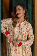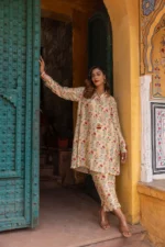 Ivory embroidered cuff co-ord set in silk and placket detailing. The embroidery has flowers, elephants & many quirky elements perfect for the upcoming festivities.