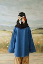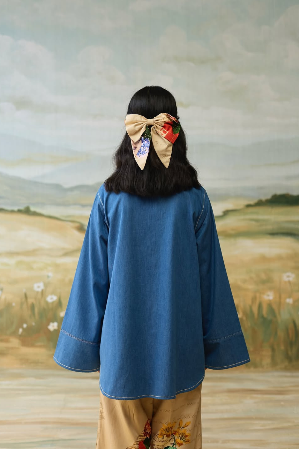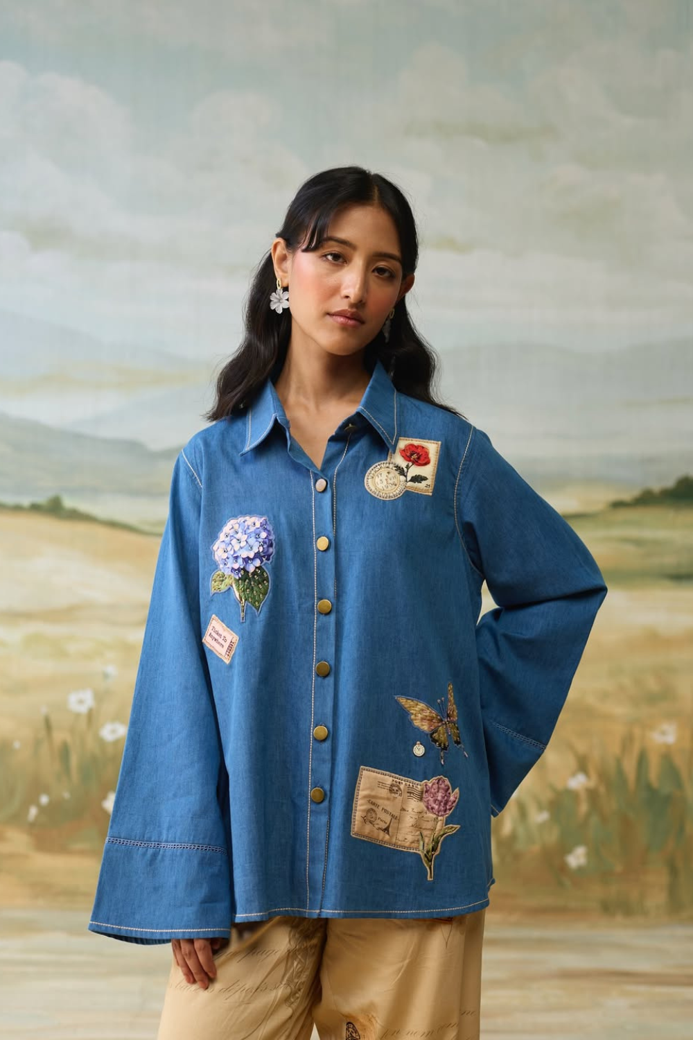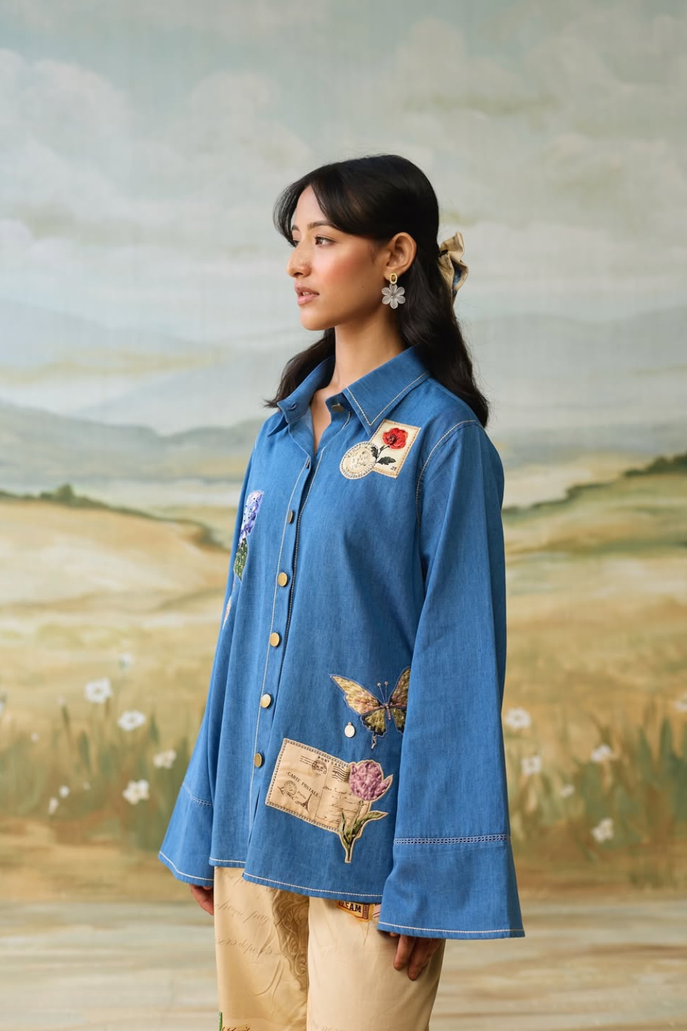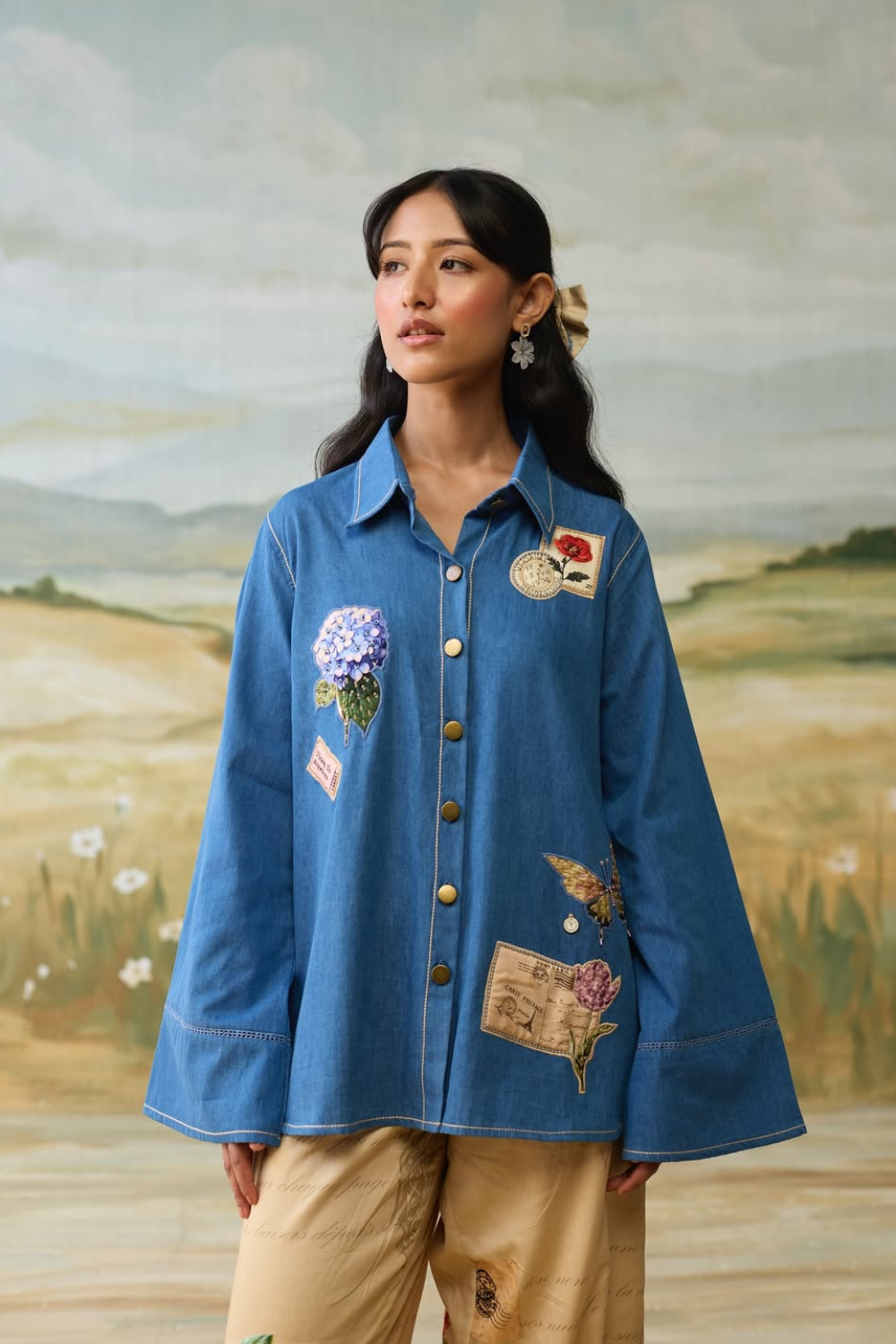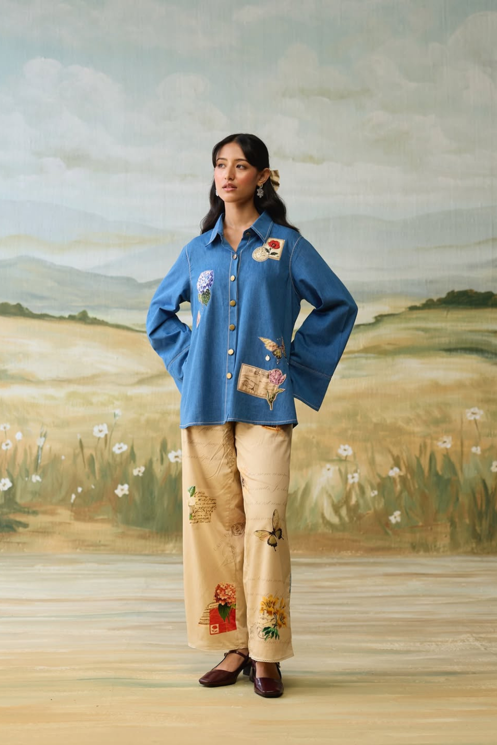 The shirt has embroidered vintage patches and scrapbook printed back. It is finished with front button fastening and lace insert on sleeves for a classic, elegant look.