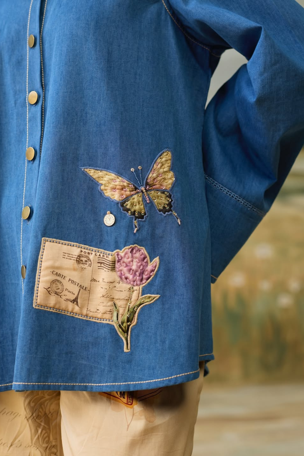 Embroidery: Applique and Beadwork on denim with stitch details