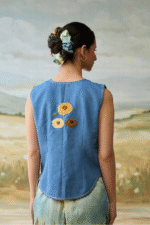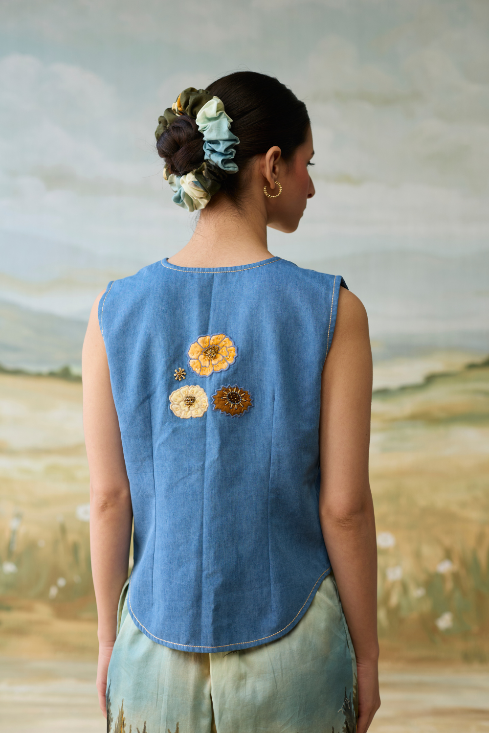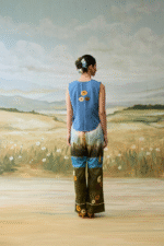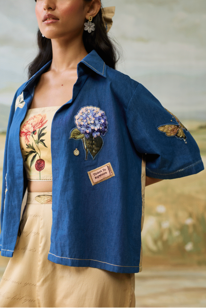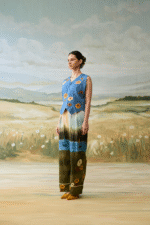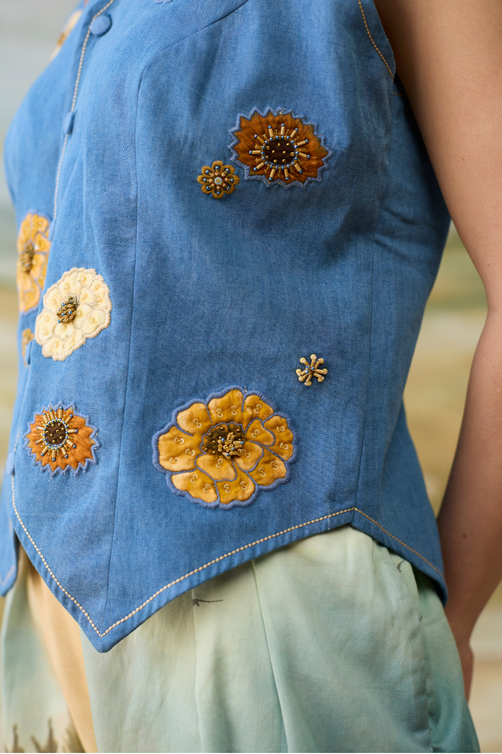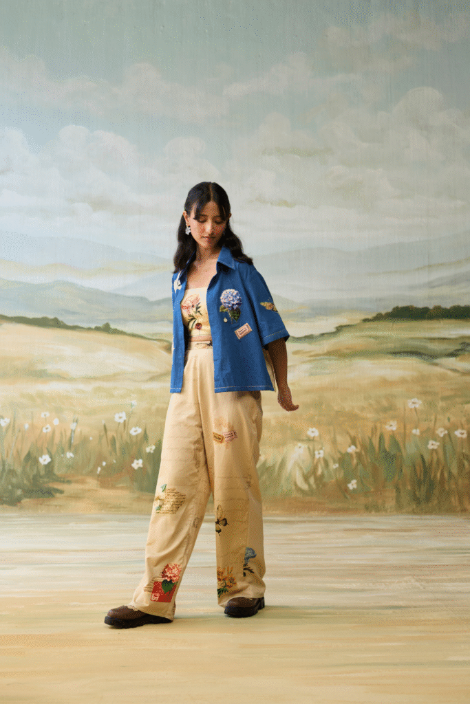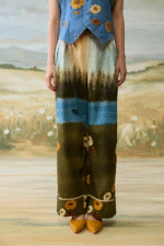 The Meadow Voyage Set features an intricately floral embroidered waistcoat paired with serene, landscape printed trousers for a whimsical and artistic inspired look.