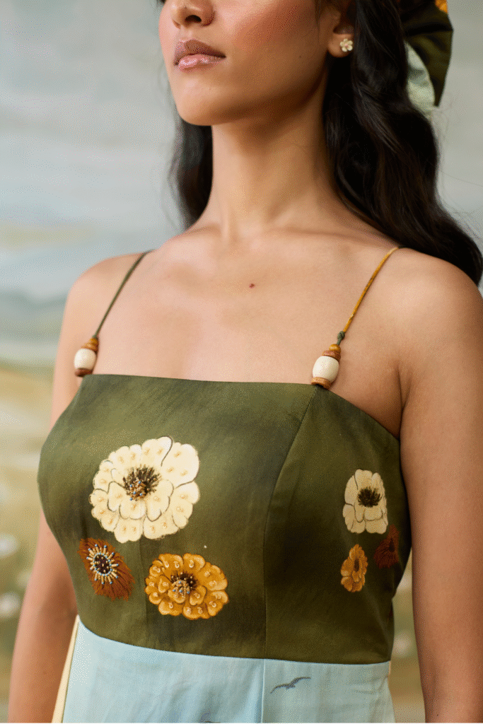 Embroidery: Applique and Beadwork on denim with stitch details