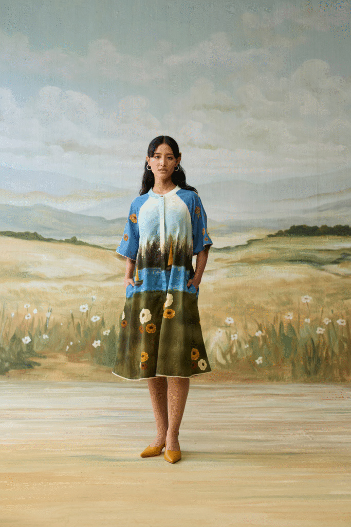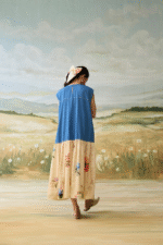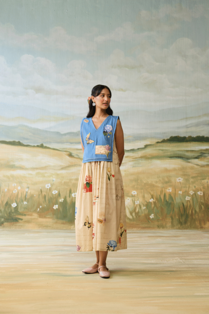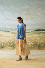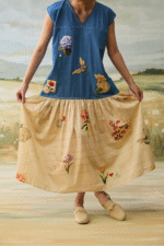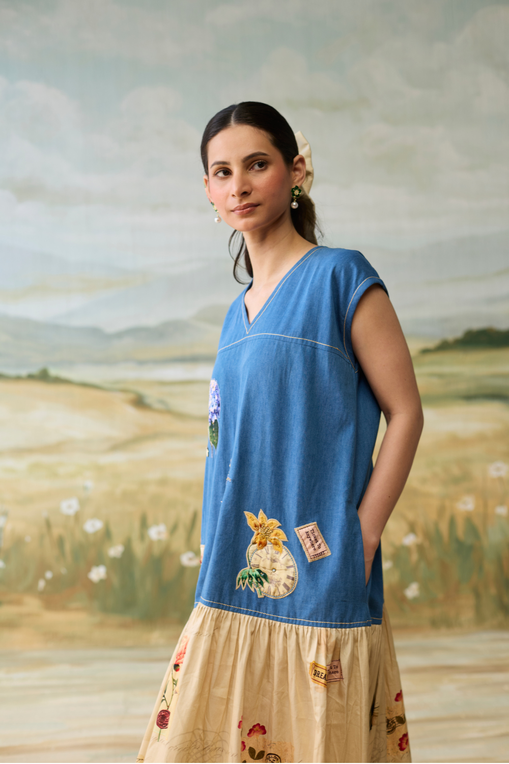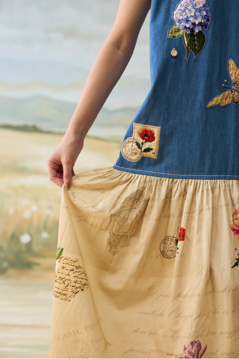 Denim Embellished patchwork three layer dress with vintage scrapbook print.