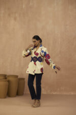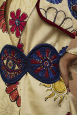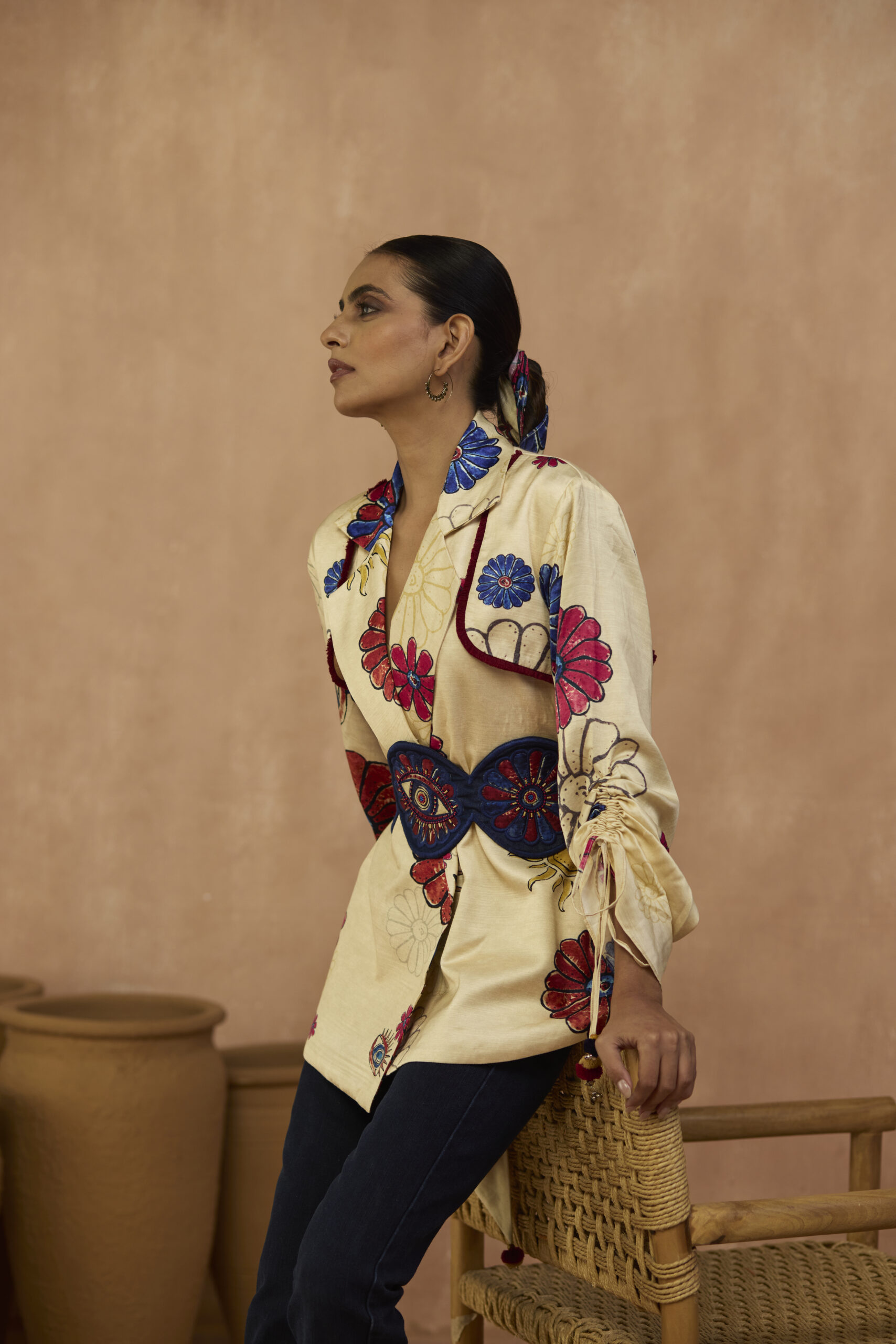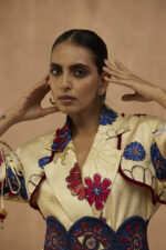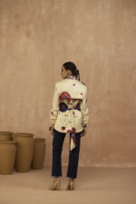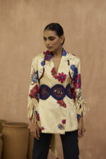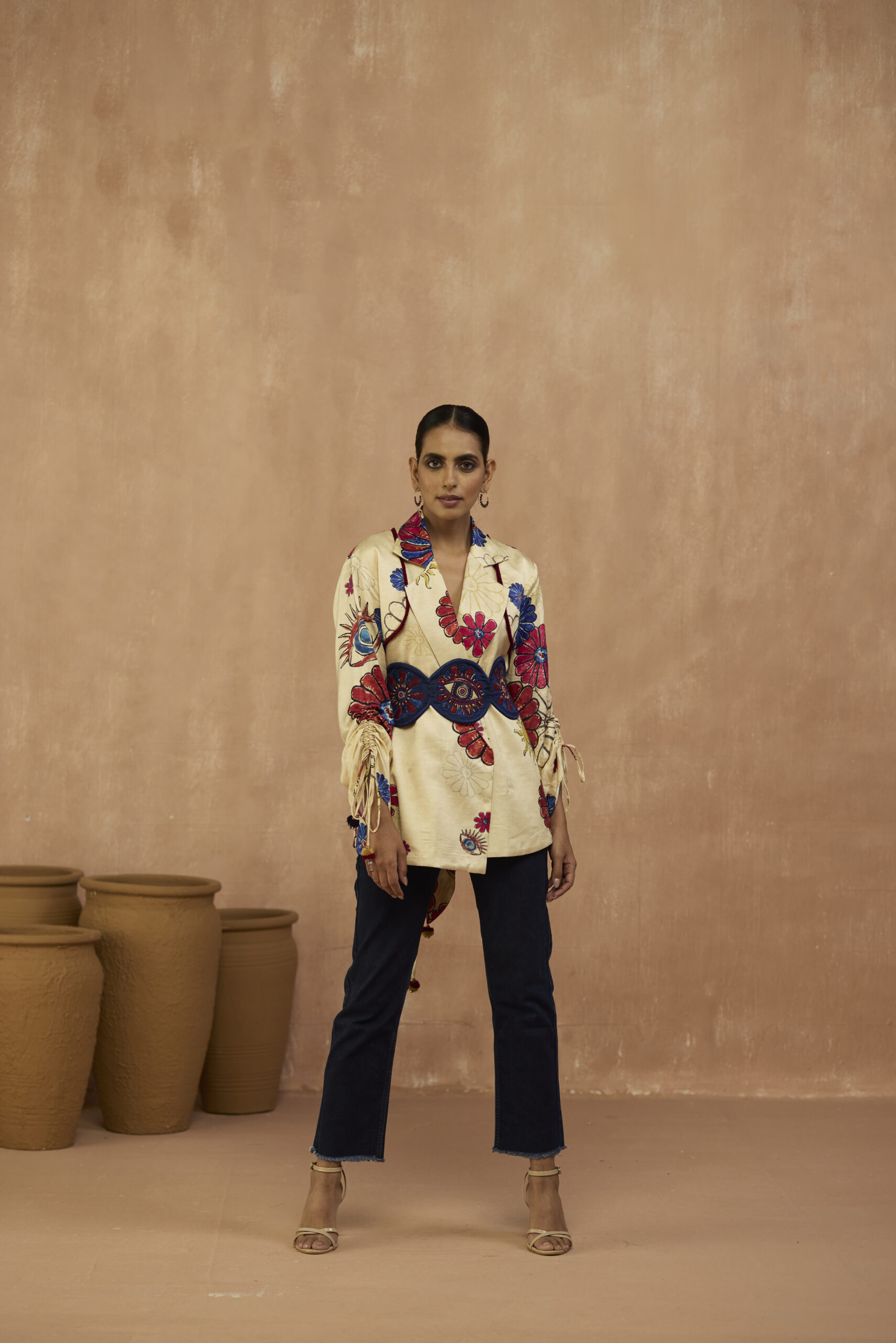 The trench jacket is adorned with fringe details is paired with hand sketched applique and beaded belt making the look smart and edgy. Pair it up with a denim of your choice.