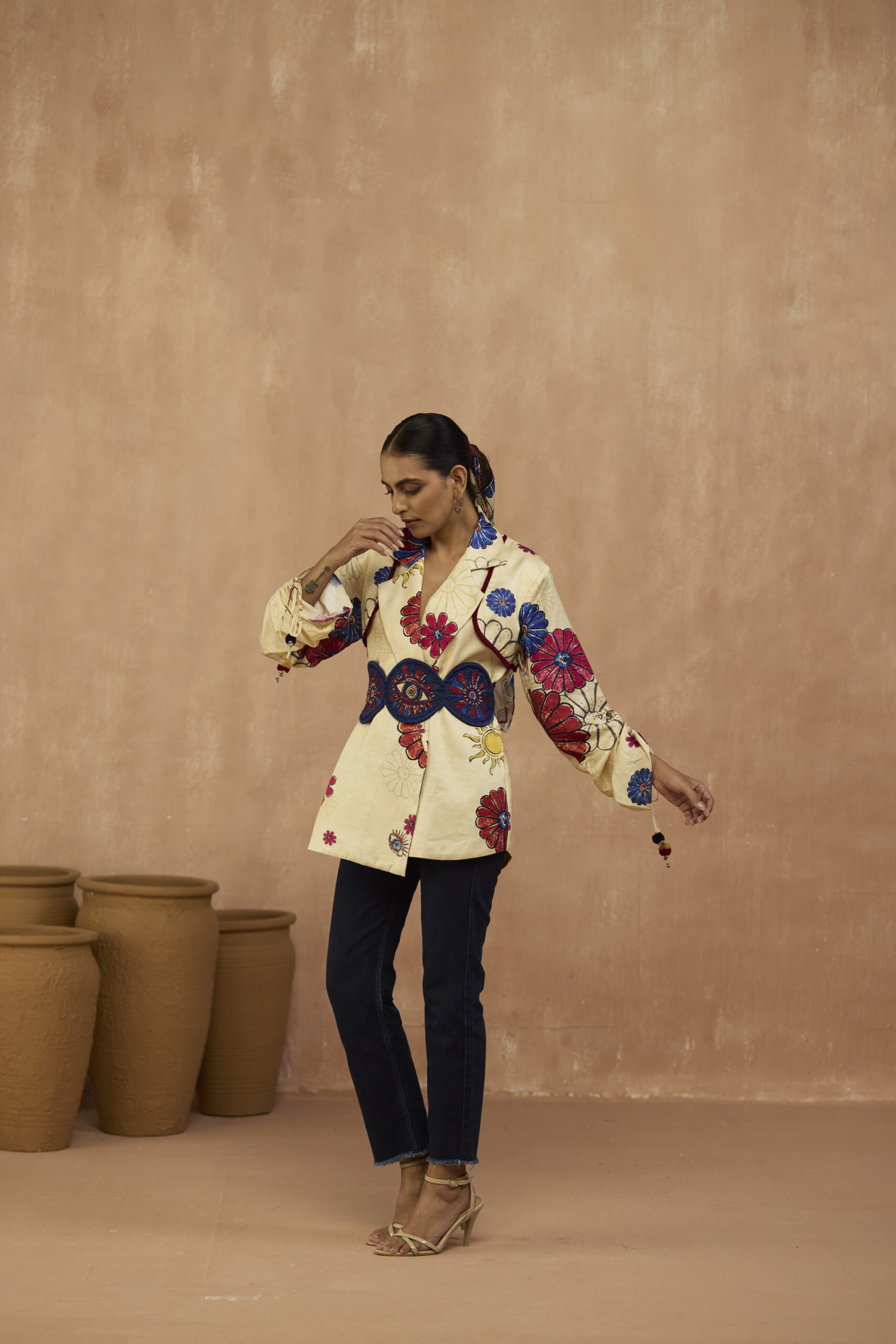 Embroidery: Applique & Beadwork on denim with stitch & Fringe details.