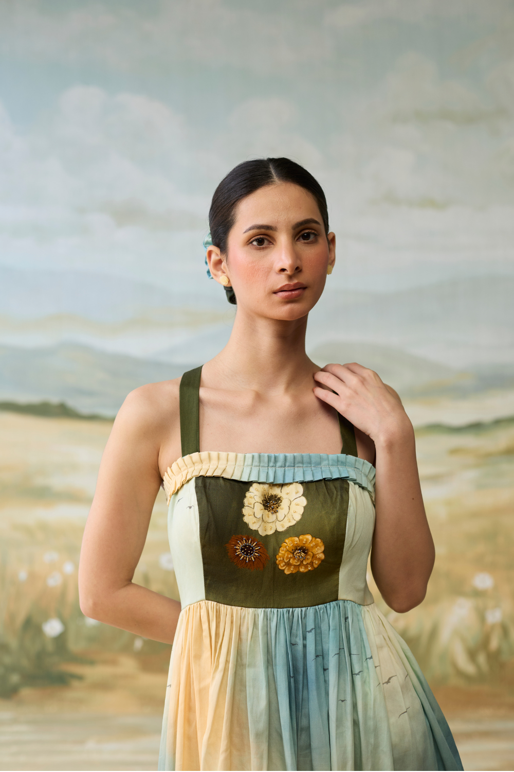 The Pastoral Voyage Dress features an elegantly pleat detail on neckline with intricate handwork, transitioning into a sweeping landscape printed skirt for. a truly artistic and whimsical silhouette.Kurta – Denim & Satin , Palazzo – Satin, Lining – Santoon