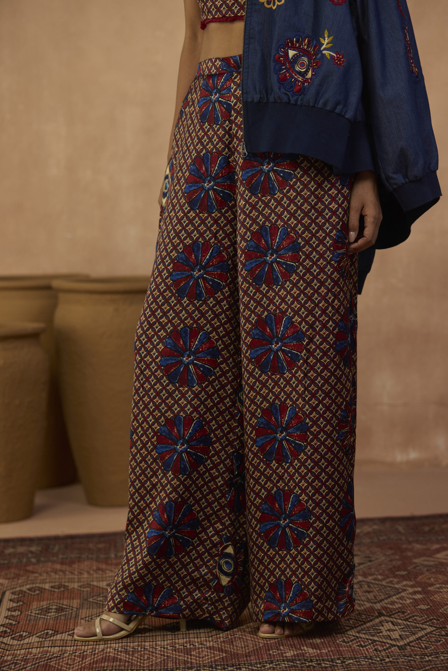 Denim Bomber jacket with applique, beadwork & stitch-line paired with our satin signature printed pants & crop top with fringe detailing.