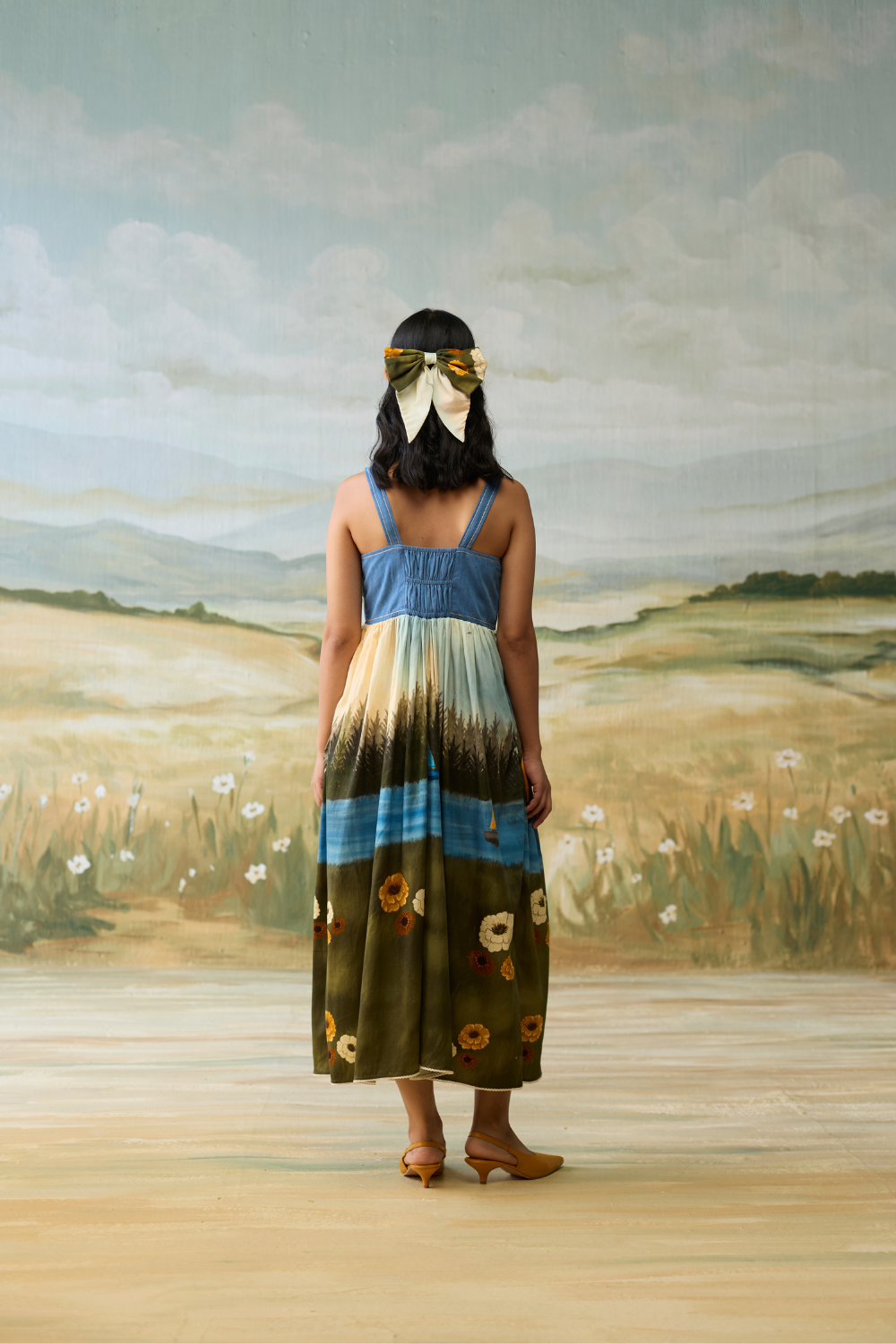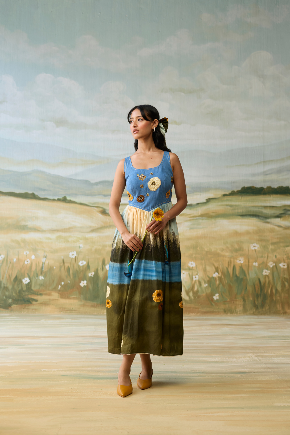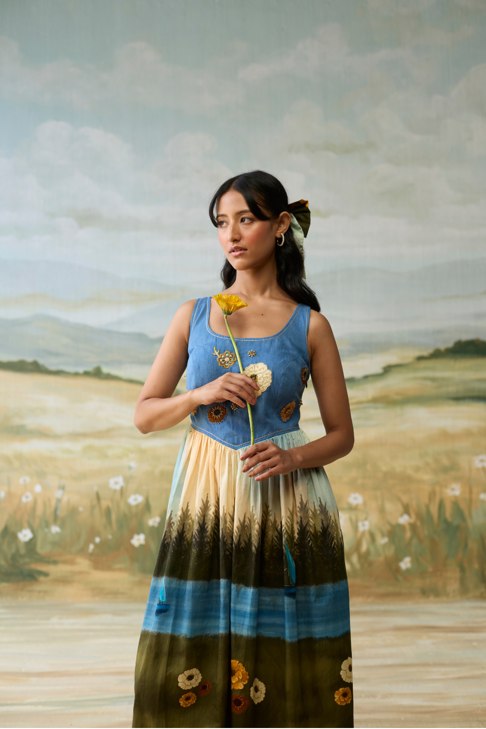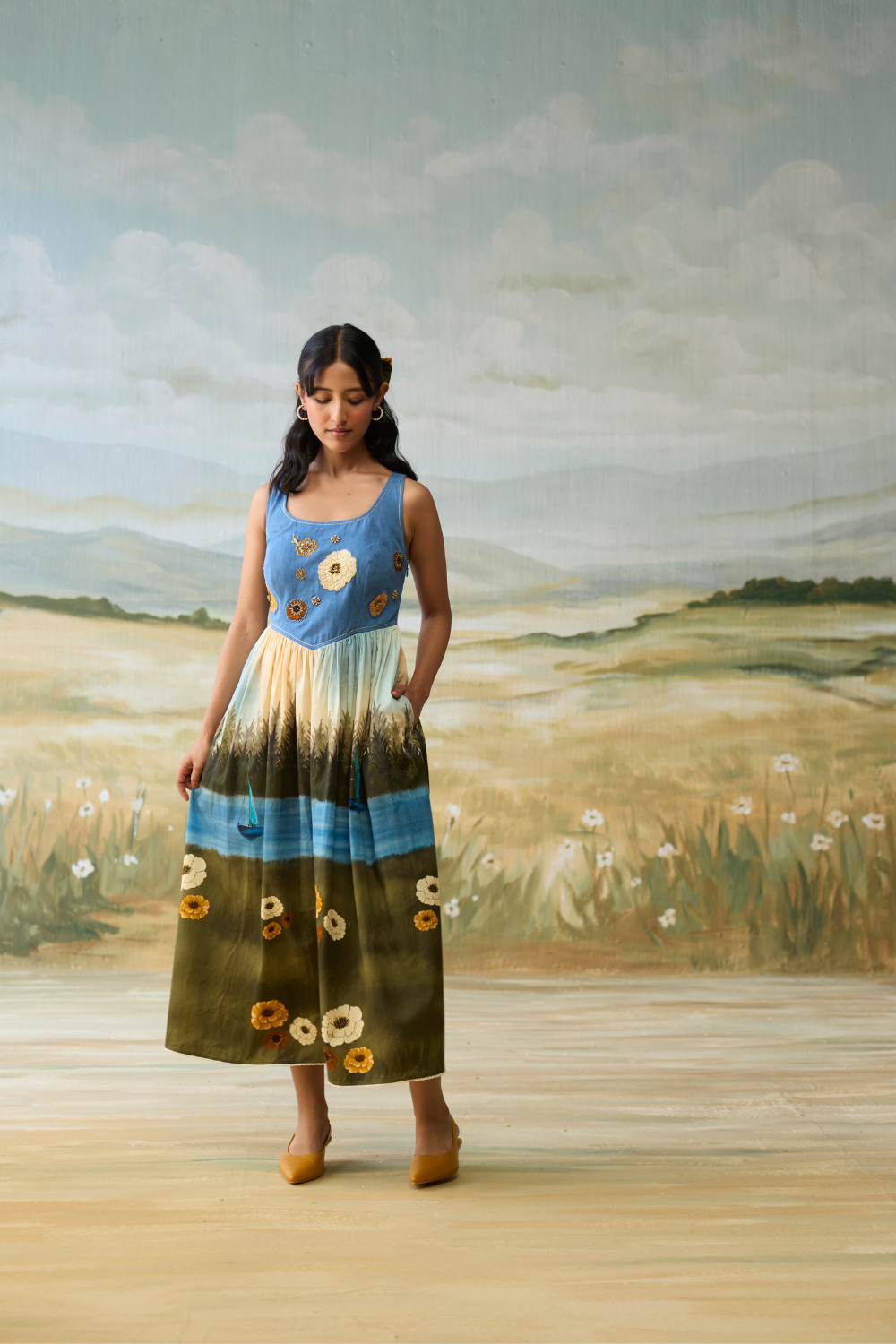 Sailing Daydream Dress has a denim embellished yoke with hand painted flowers and a hand painted scenic print. The pleats make it chique and elegant.