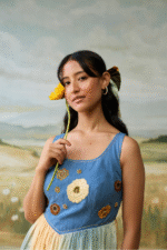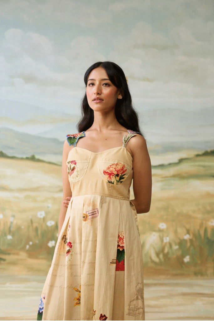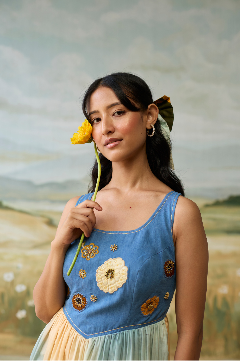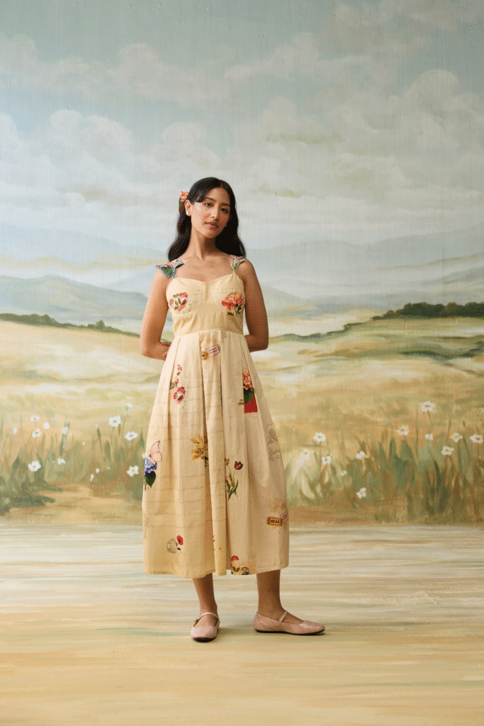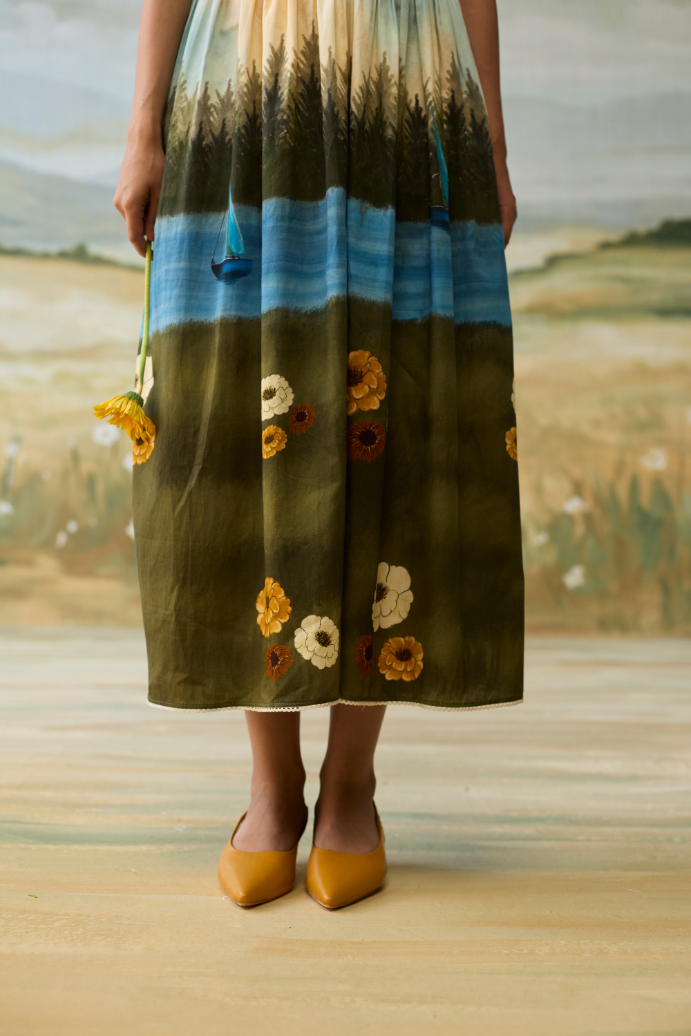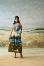 Sailing Daydream Dress has a denim embellished yoke with hand painted flowers and a hand painted scenic print. The pleats make it chique and elegant.