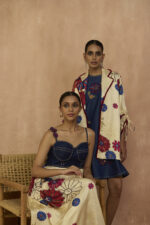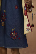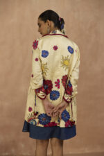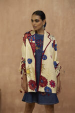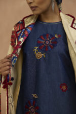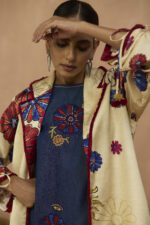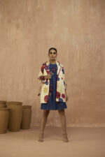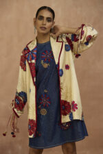 Classic denim sleeveless dress with applique and beadwork paired with satin signature printed blazer with collar & sleeve detailing