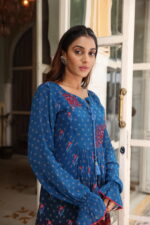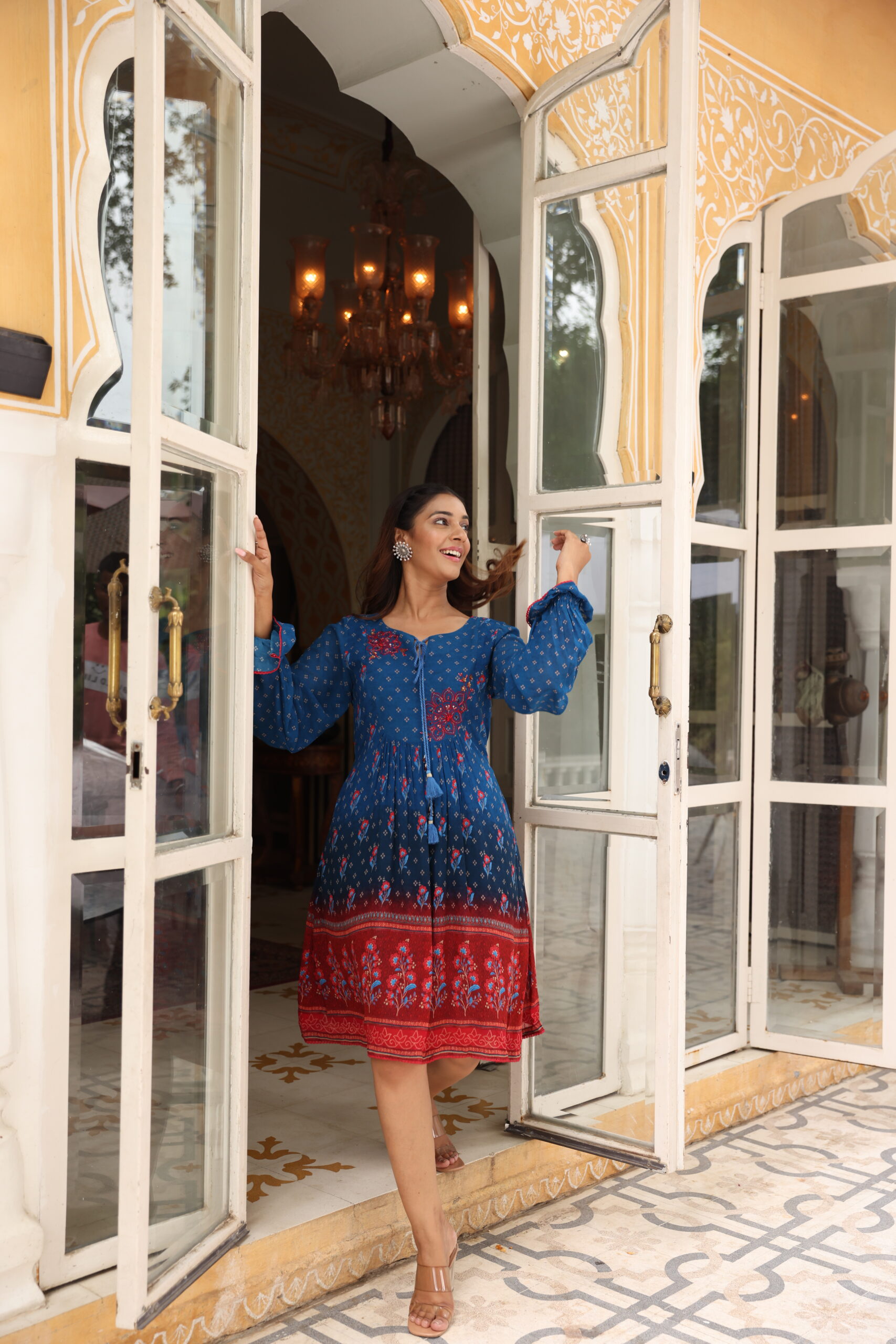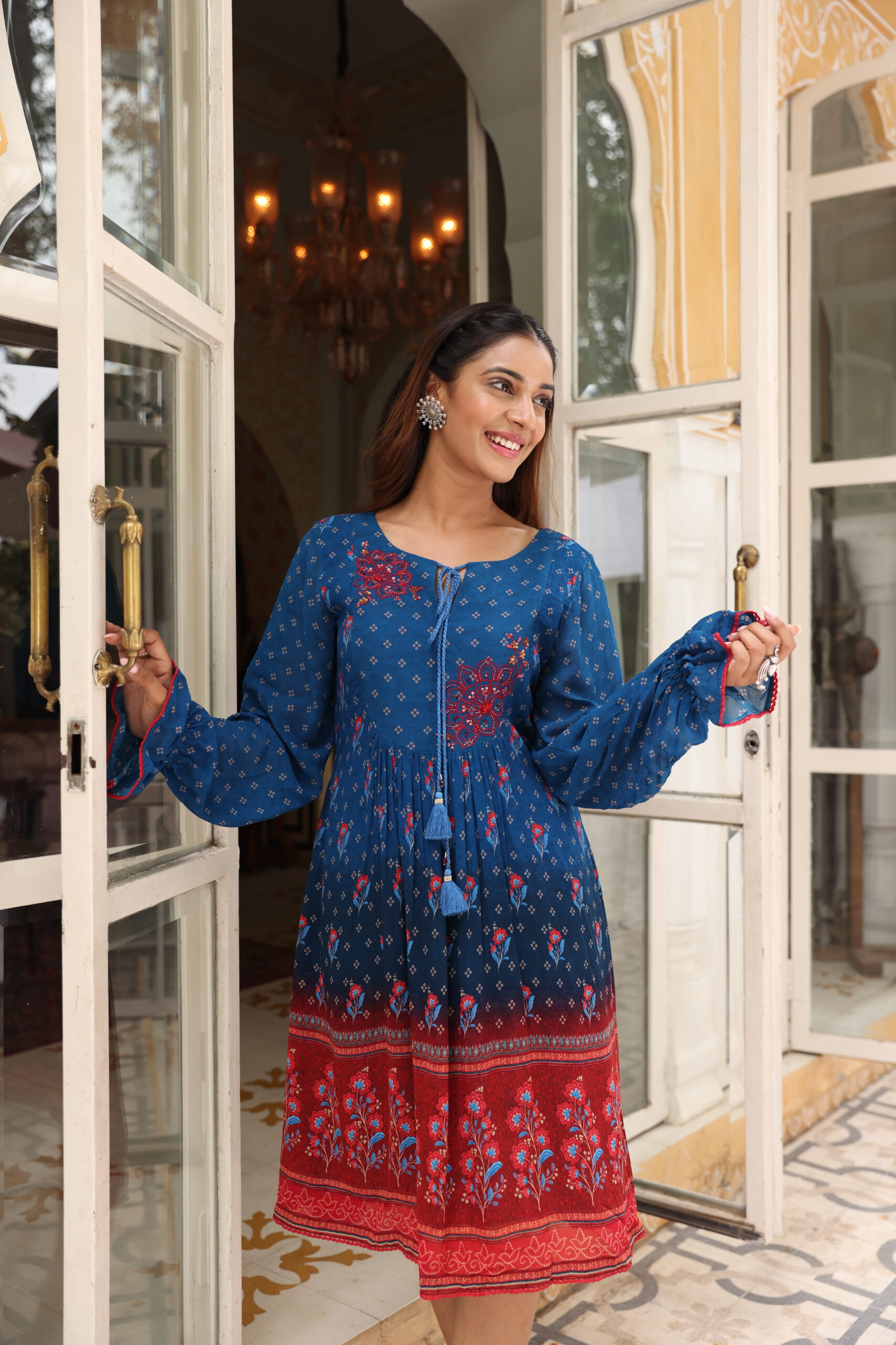 Blue georgette embellished dress with cute sleeve details.