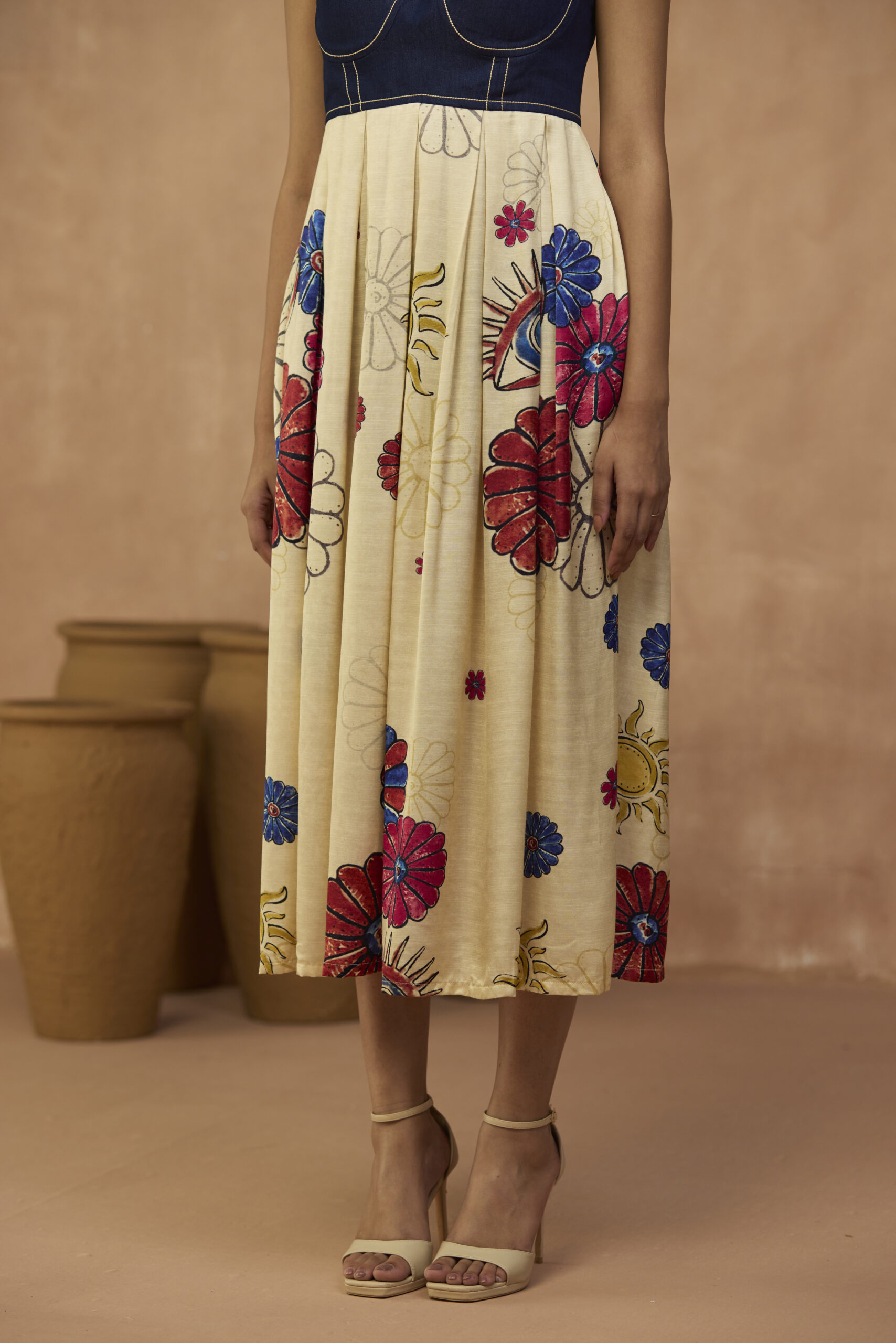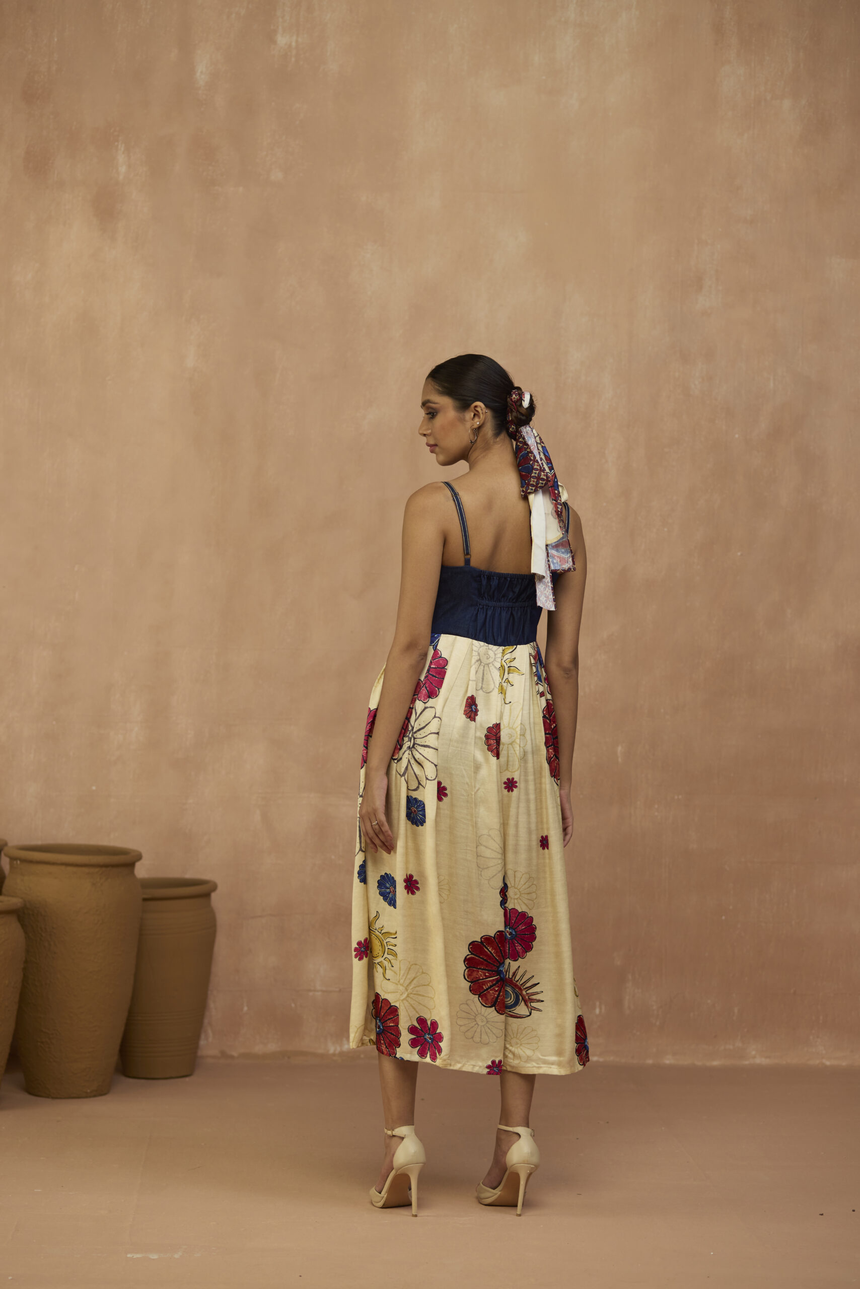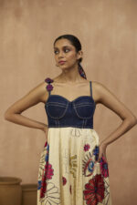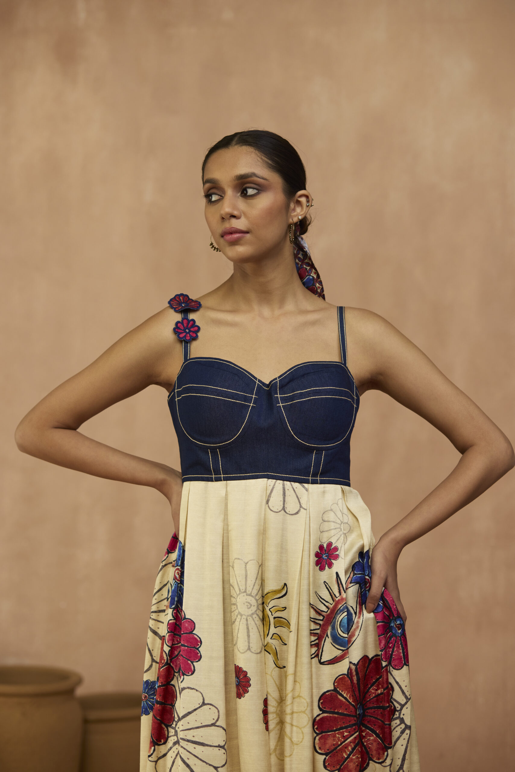Classic denim bralette dress with smart stitch lines. Embroidered straps add a touch of elegance with the signature printed twill and fringe details