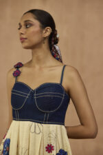 Embroidery: Applique & Beadwork on denim with stitch & pom pom details