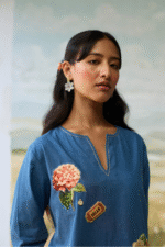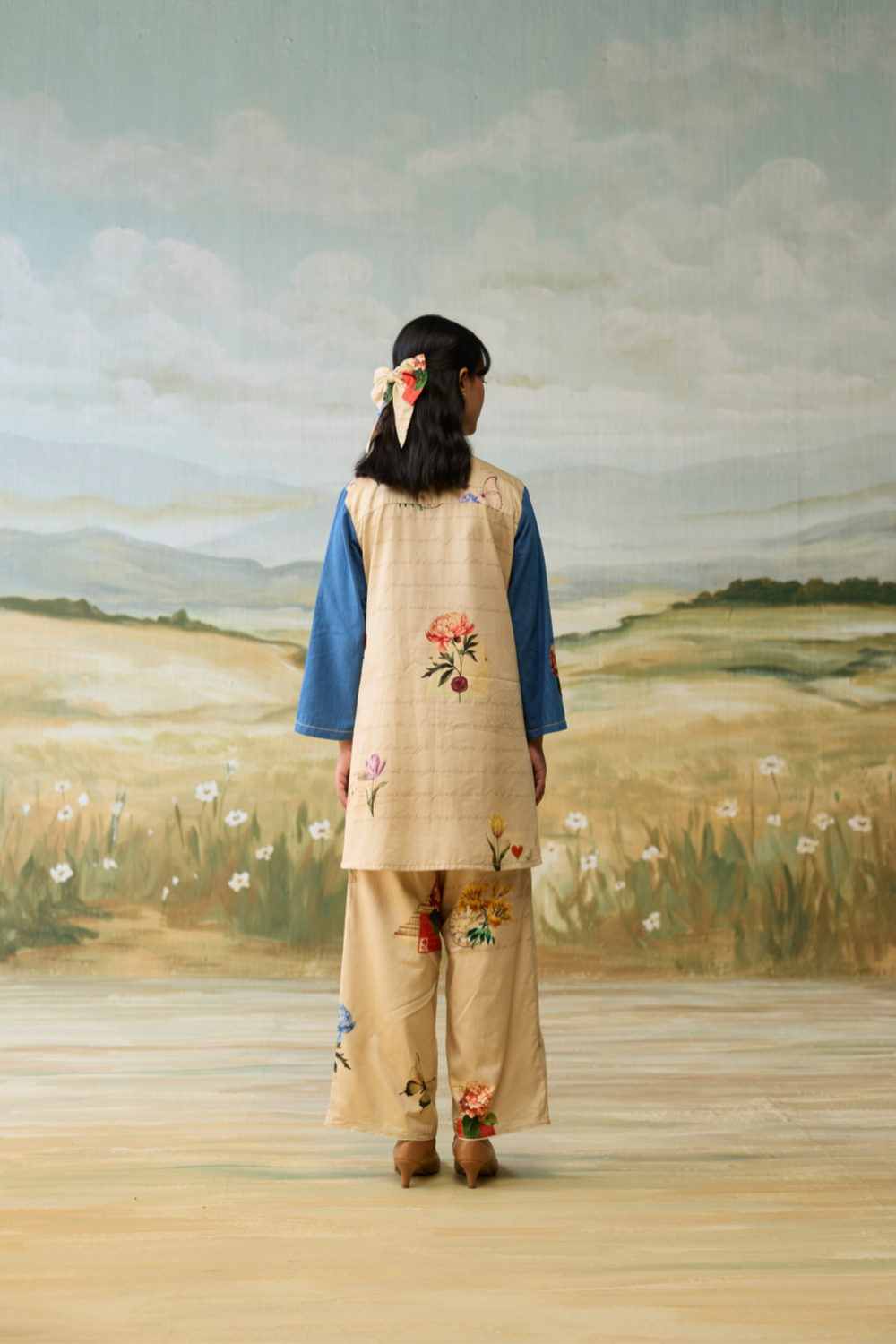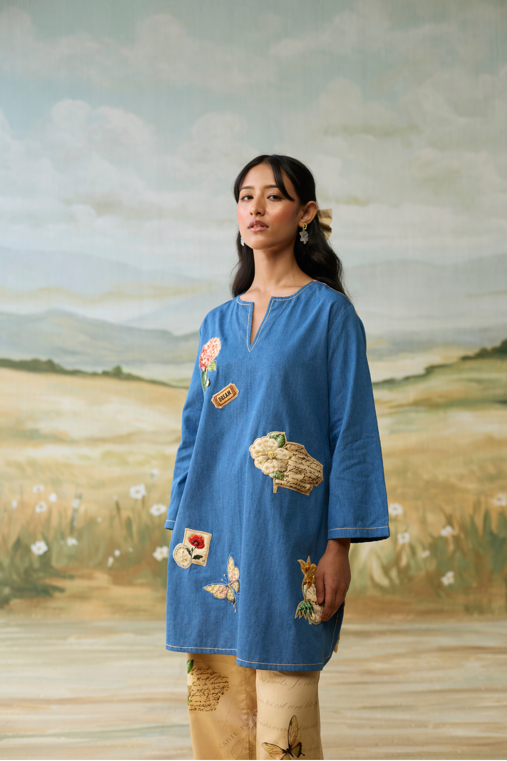 Denim embellished tunic paired with scrapbook printed pants.